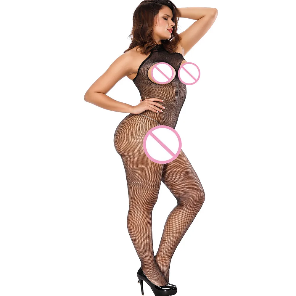 Women Fun Bodysuits Black Sexy Halter Neck Translucent Backless Three Points Hollow Mesh Bodysuits Exotic Open Crotch Teddies