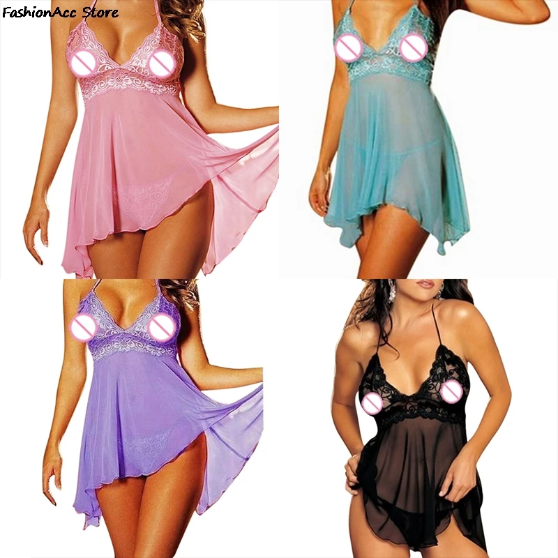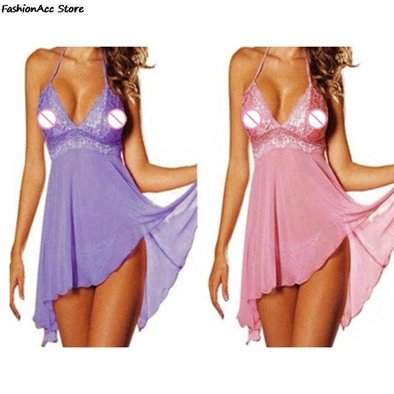 Sexy Women Black Lace Baby Dolls Nightdress With Lingerie Babydoll Set Sleepwear Blue/Purple/Pink