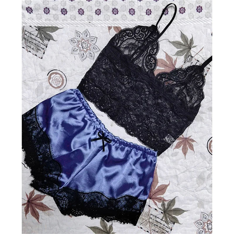 Women Fashion Lace V Neck Pajamas Set Lingerie Sleeveless Nightwear Crop Women's Sleepwear Sexy Satin Pajama Set Top And Shorts