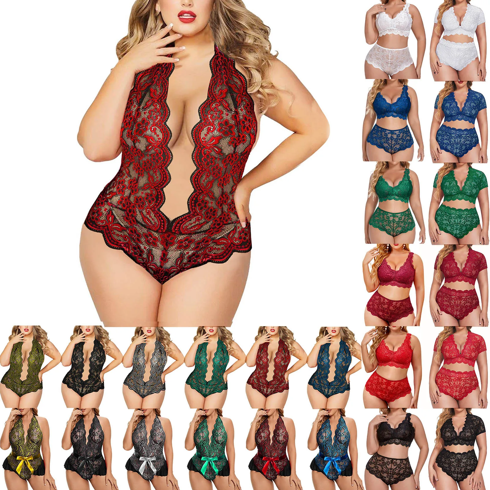 Sexy Lace Crotchless Lingerie Deep V Revealing Chest Hot Open Erotic Backless Bra Women Hollow Underwear Set Teddy Night Dress