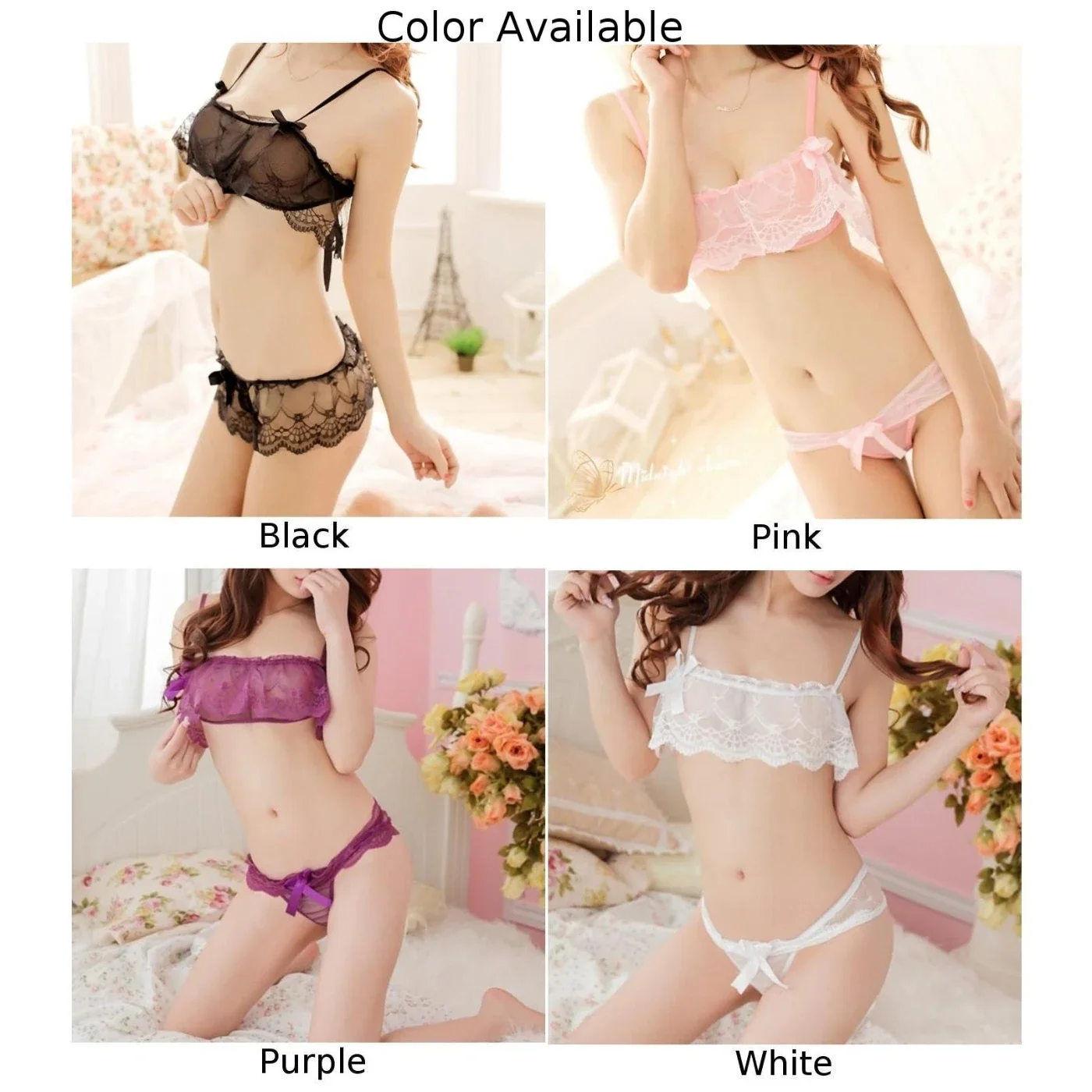 Women’s Lace Sexy Sheer Lingerie Transparent Lace Suspenders Bra Thong Panties 2pcs Set Nightwear Mini Sleepwear Erotic Outfit