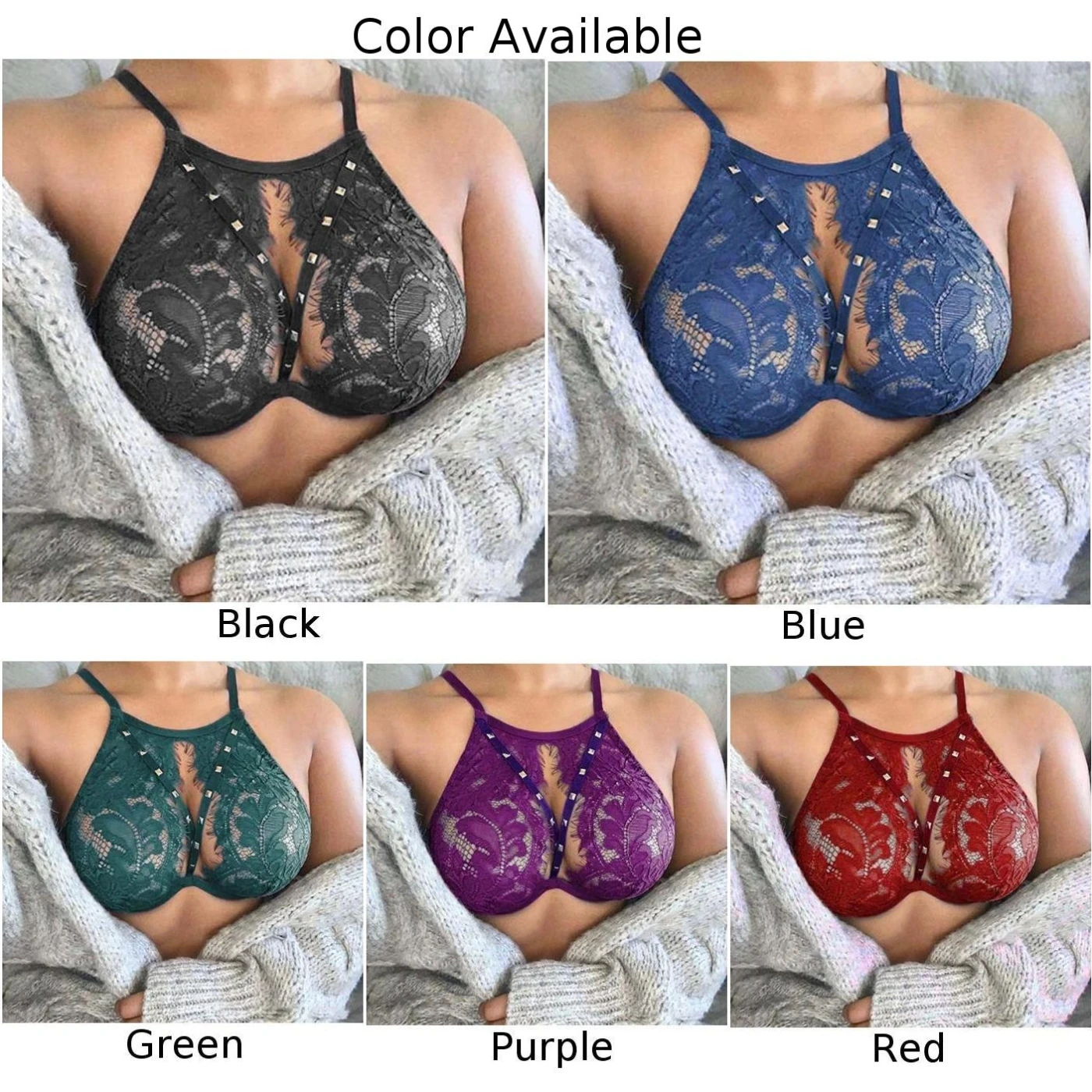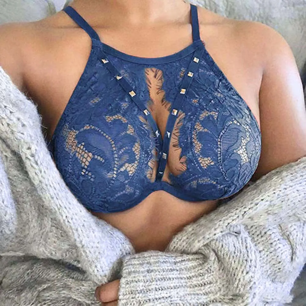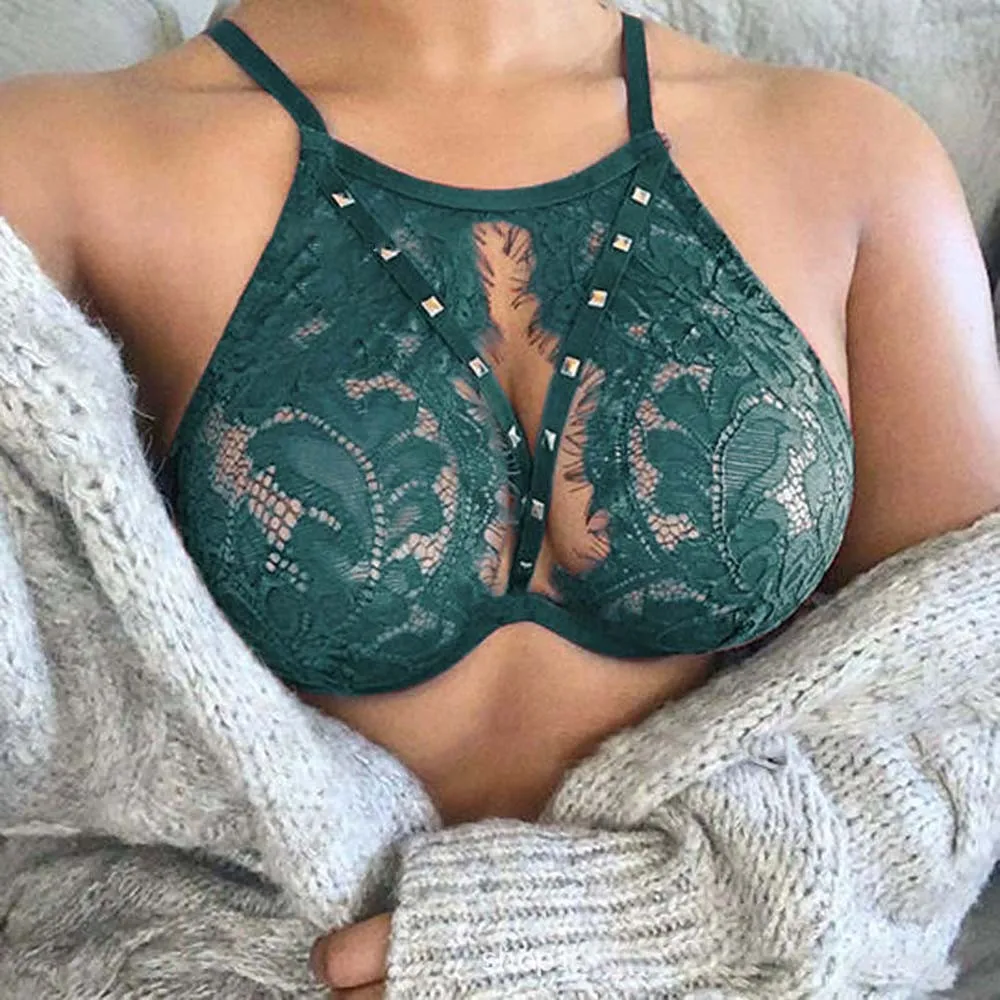 Womens Sexy Sheer See Through Bra Top Lace Rivet Bralet Crop Tops Underwear Suspenders Hollow Push-up Bra Erotic Lingerie