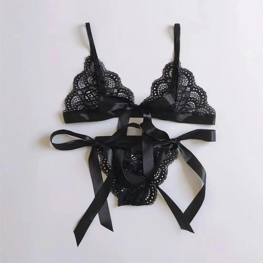V Neck Bra Panties Set Sexy Lace Bra Panties Set with Bow-knot Detail V Neck Spaghetti Strap Set See-through Three for Women