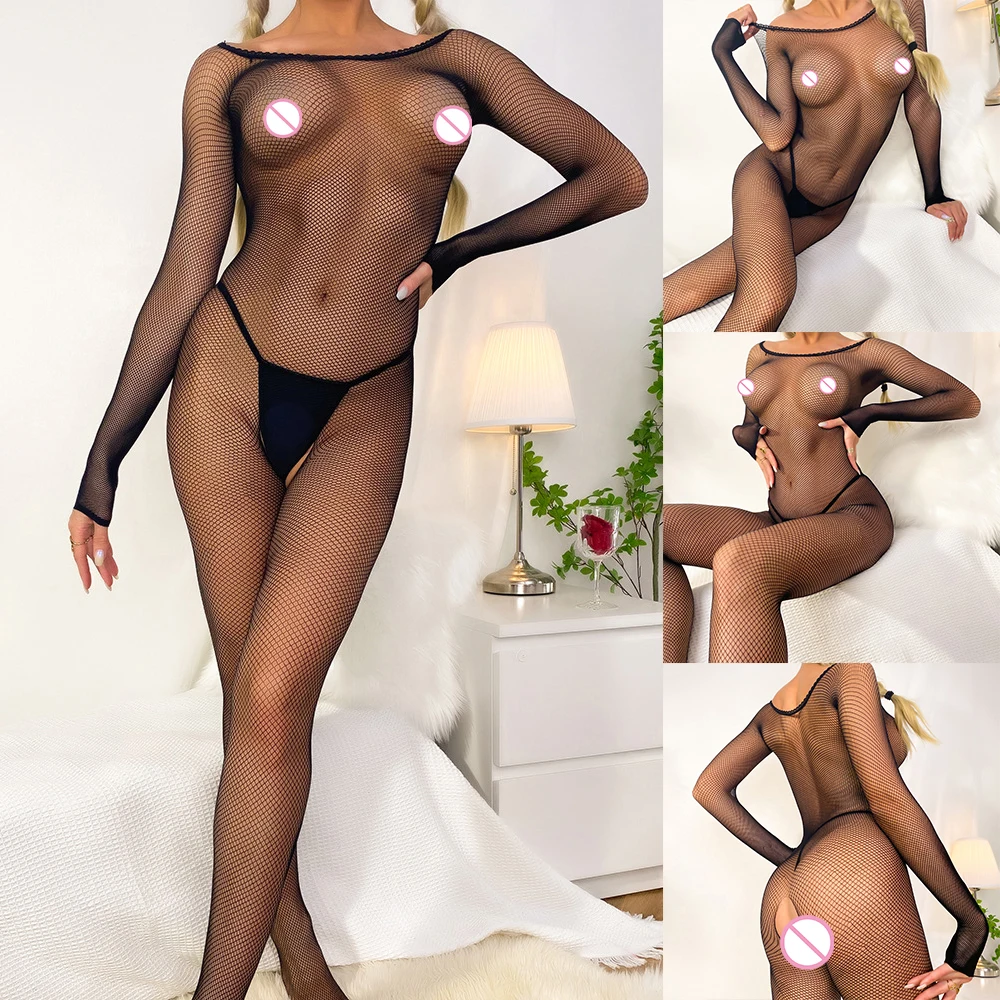 Women Full Body Stocking See Through Fishnets Mesh Bodysuit Sexy Open Bra Jumpsuit Costumes Pantyhose Tights Erotic Lingerie