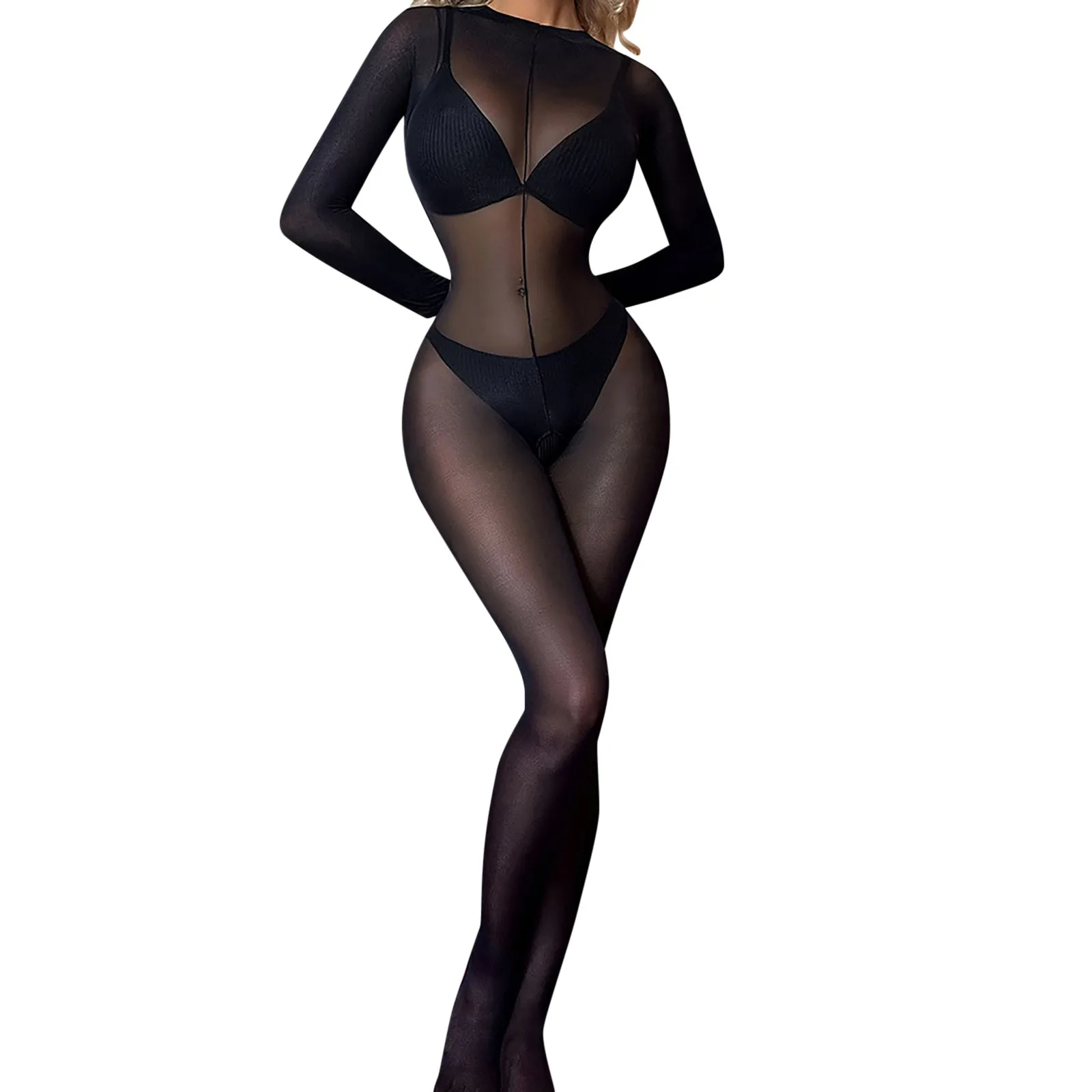 Women's Fun Lingerie Sexy Stockings Jumpsuit Black Stocking Seductive Underwear Long Sleeve Perspective Tight Fit Sexy Lingeries