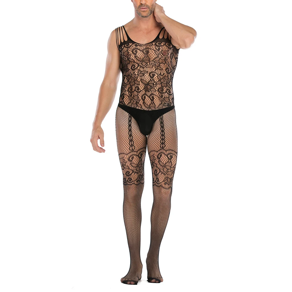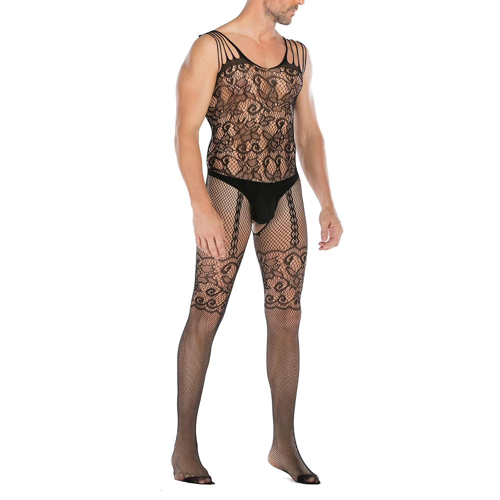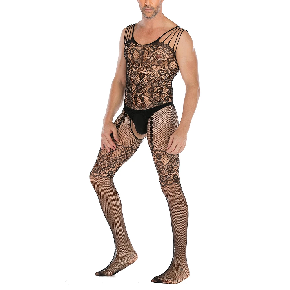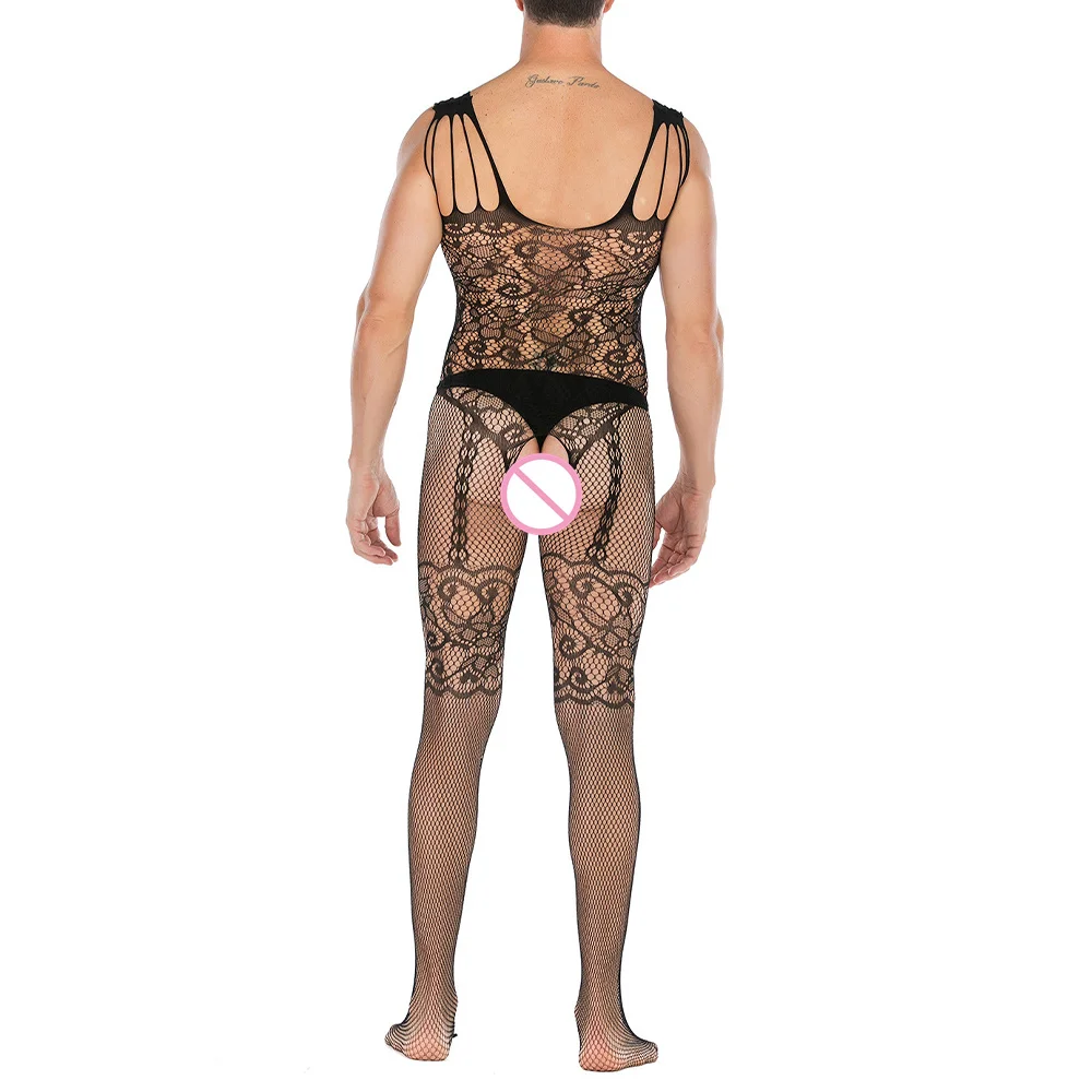 See-Through Fishnet Bodysuit Mens Sexy Lingerie Open Butt Pantyhose Hosiery Gay Jumpsuit Sissy Body Stockings Erotic Lingerie