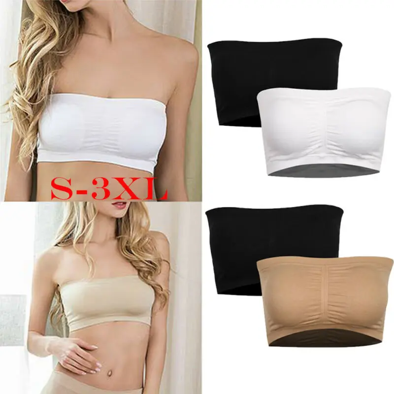 Plus Size Womens Strapless Boob Tube Bandeau Crop Top Stretch Bra Removable Padded Top Stretchy Seamless Bandeau Tube Tops