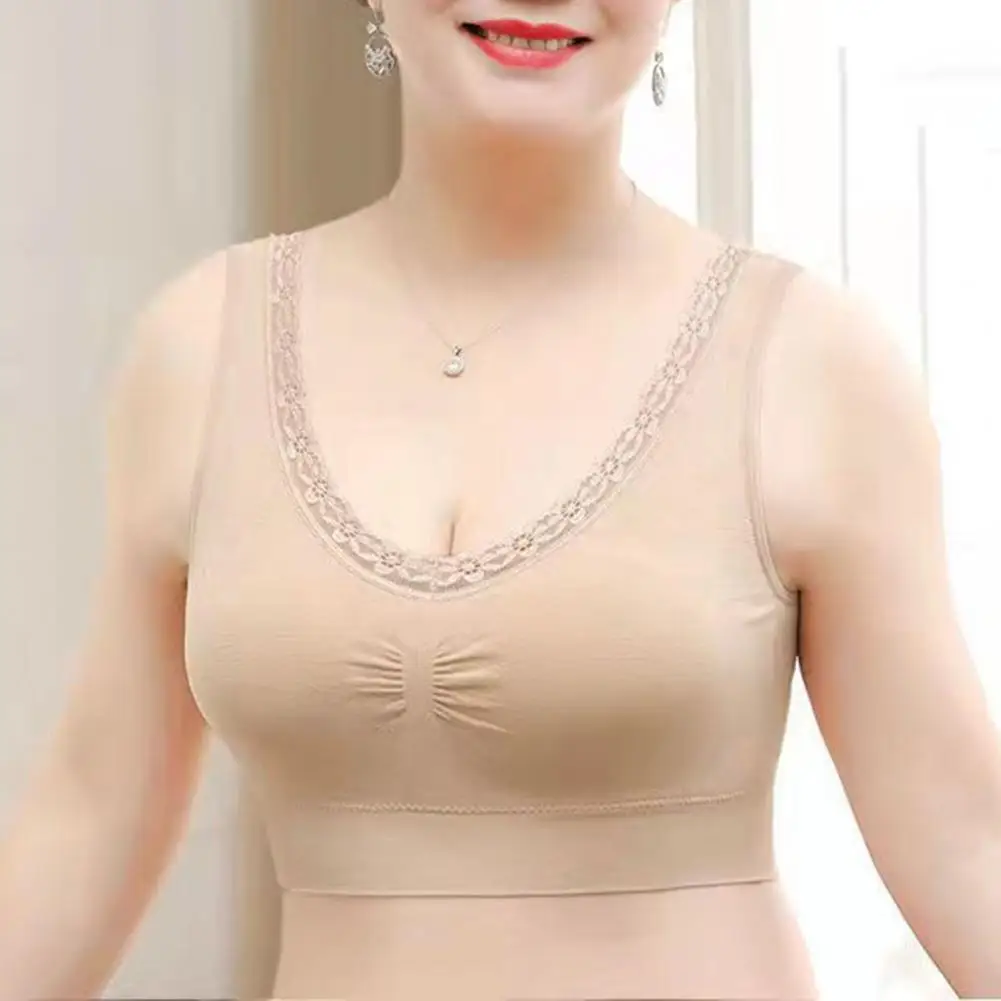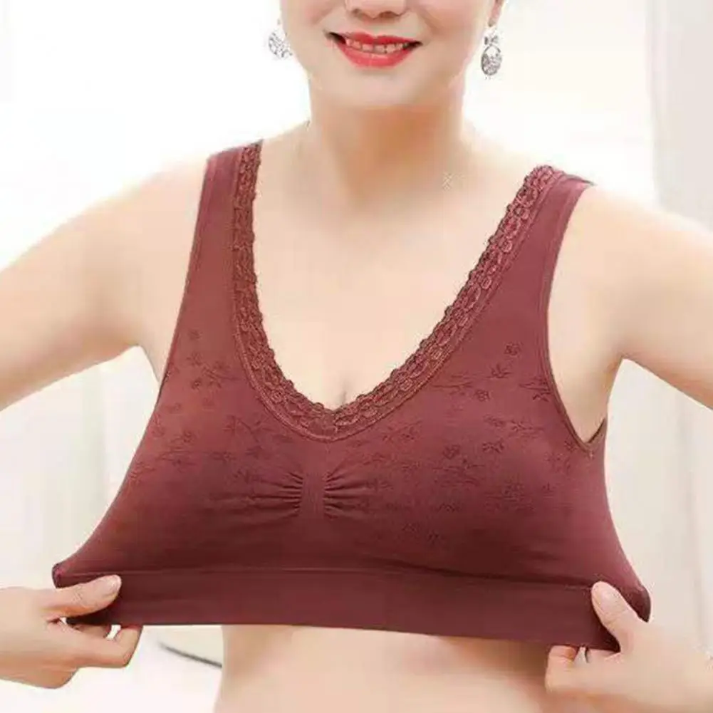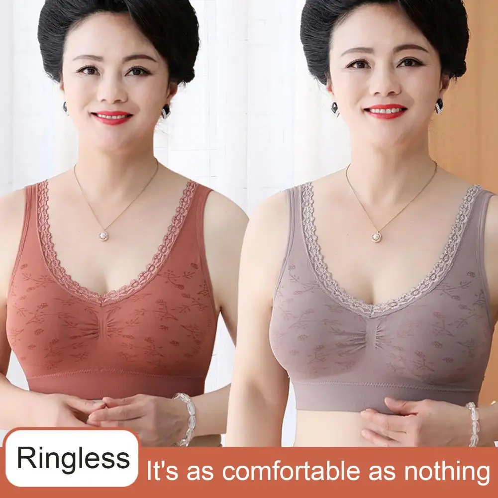 Vintage Women Bra Flower Print Lace Elastic Wide Shoudler Strap Paddes Seamless No Wire Mid-aged Lady Mother Bra Underwear