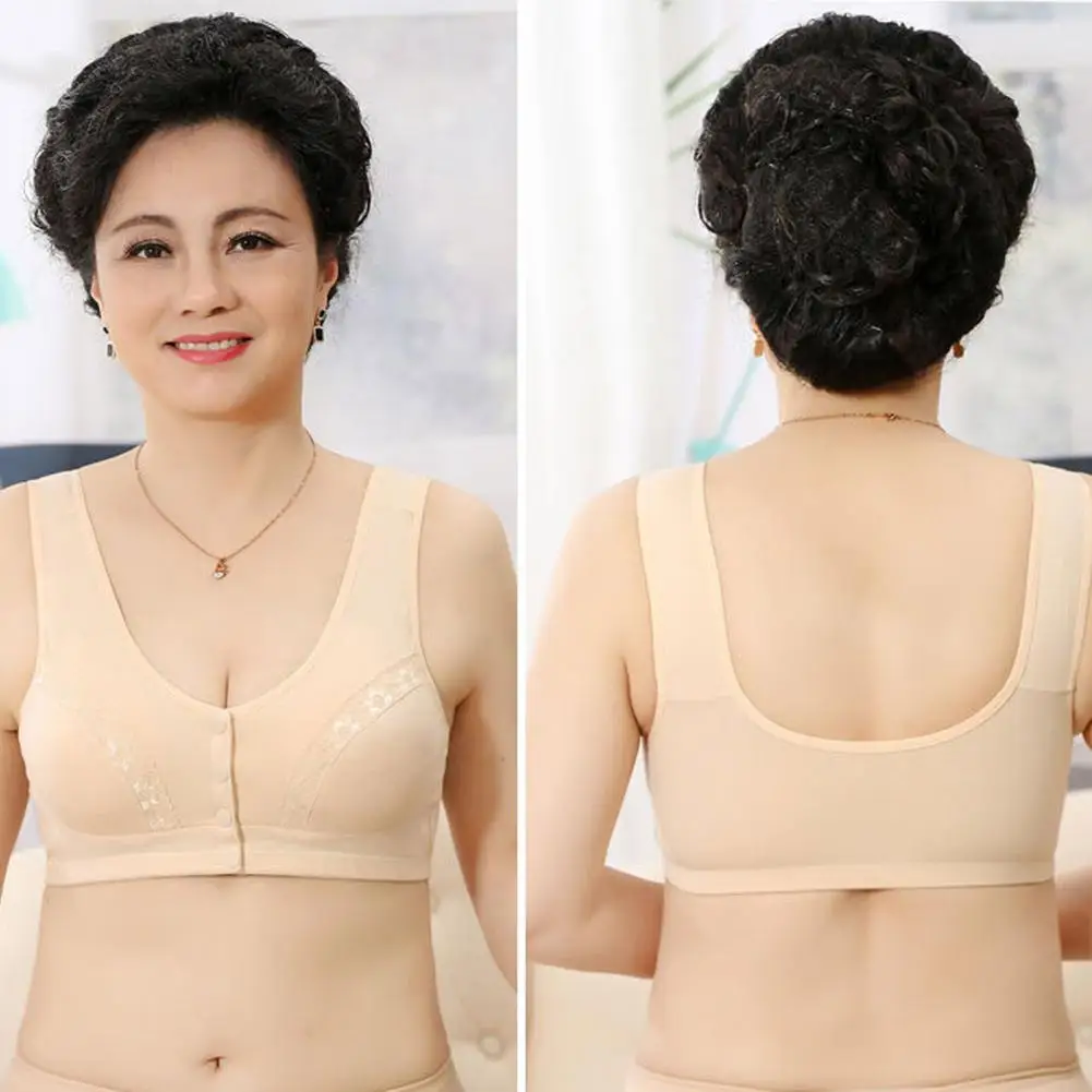 Lace Panel Bra Comfortable Wireless Front Button Closure Sport Bra for Mid-aged Women with Lace Splicing Removable Padded