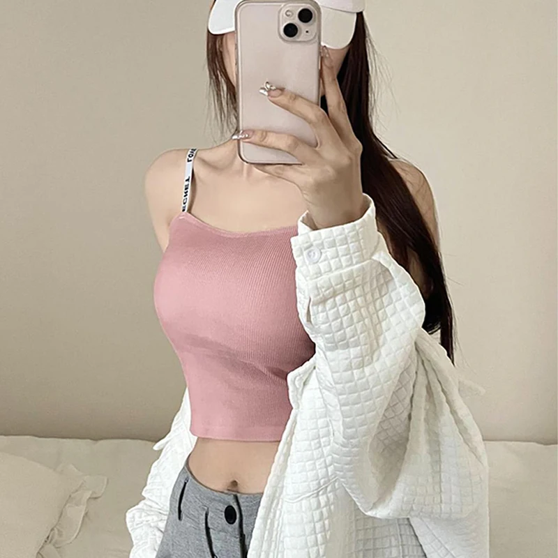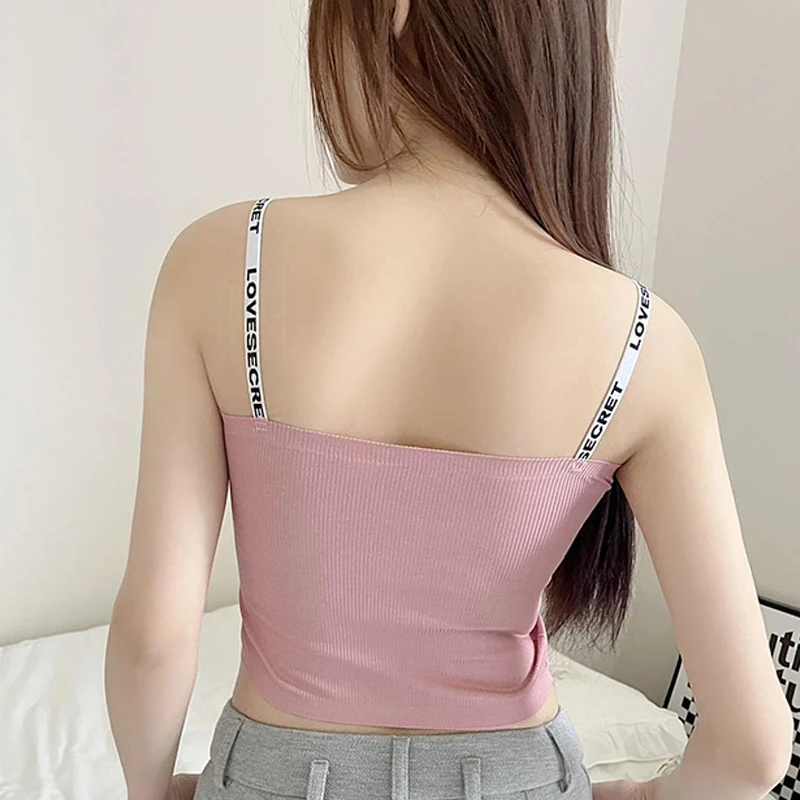 Korean Women's Letter Print Spaghetti Straps Seamless Slim Camisole With Chest Pad
