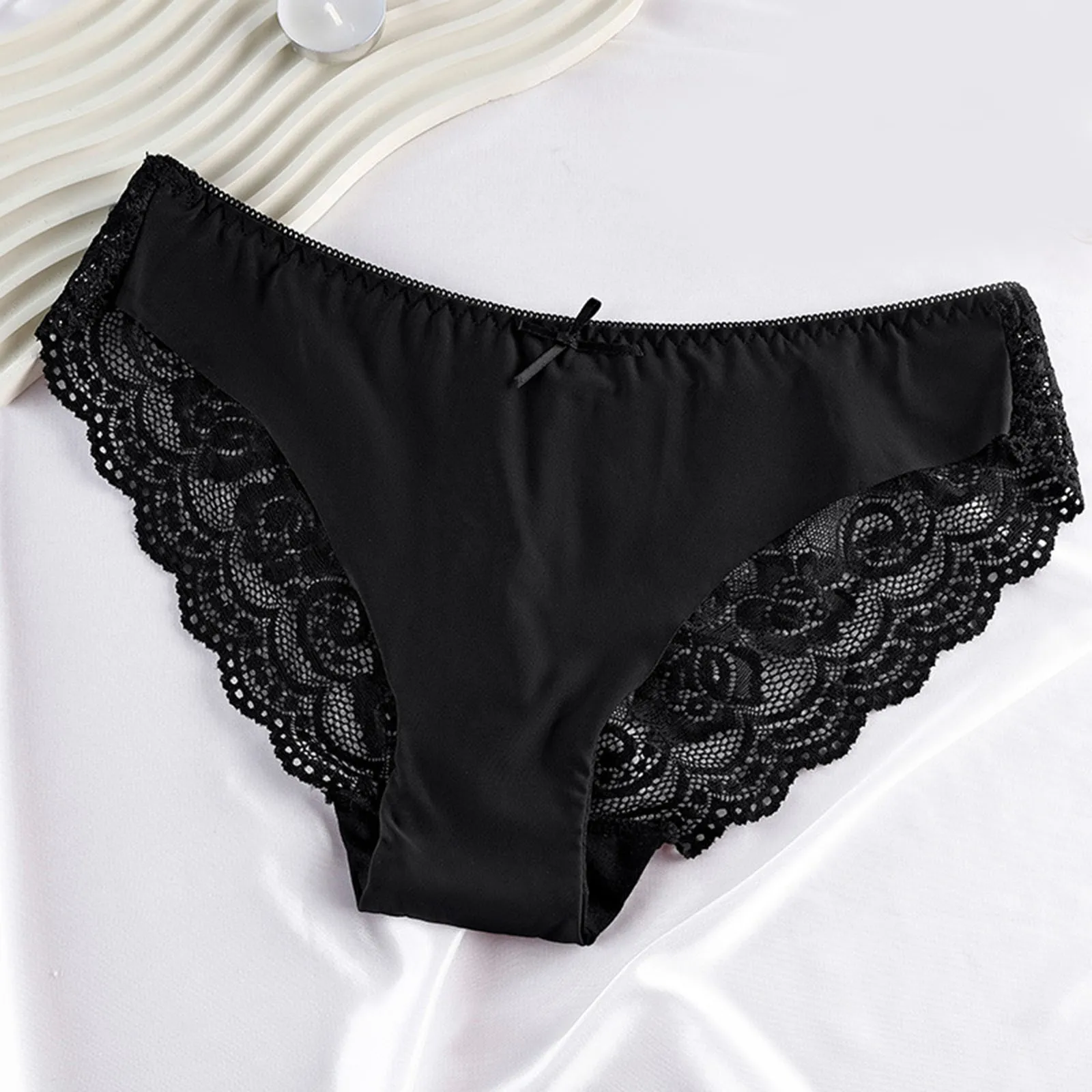 Low Waist Ice Silk Seamless Red Panties Women's Lace Briefs Sexy Solid Color Hollow Out Transparent Breathable Red Underpants