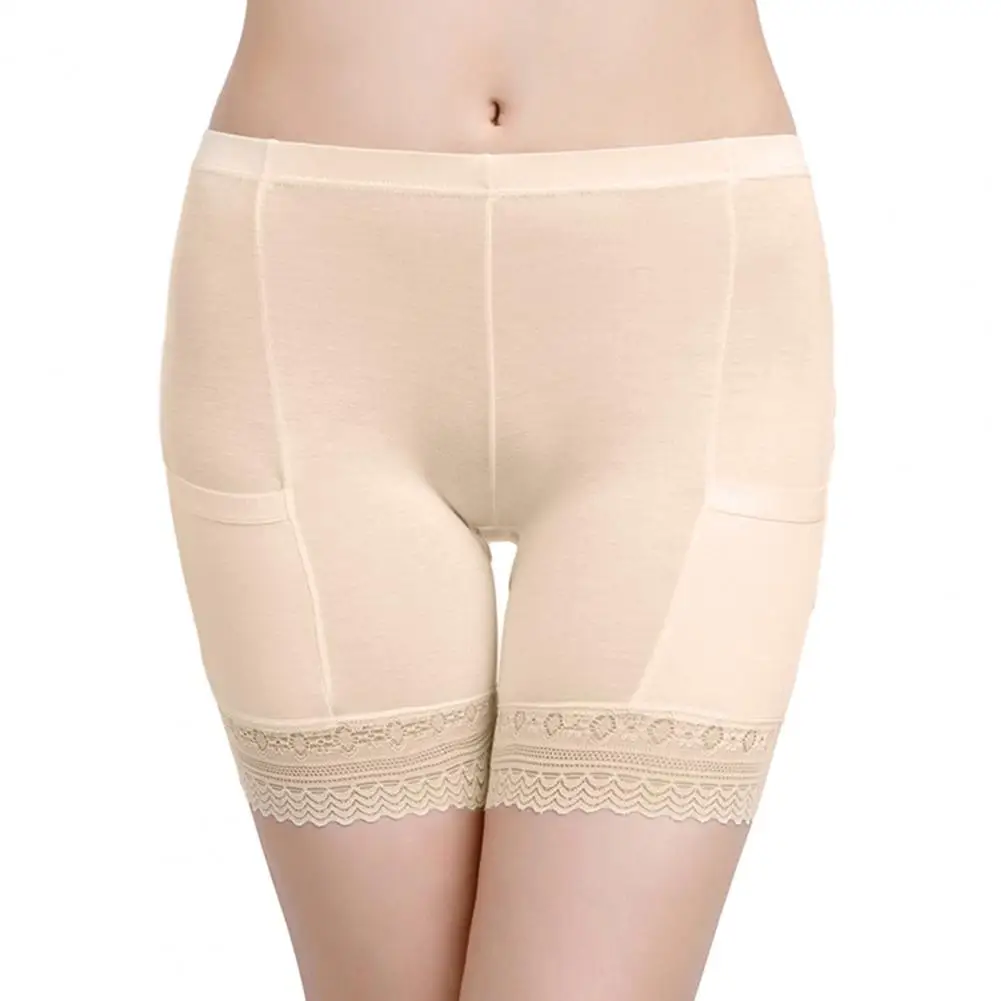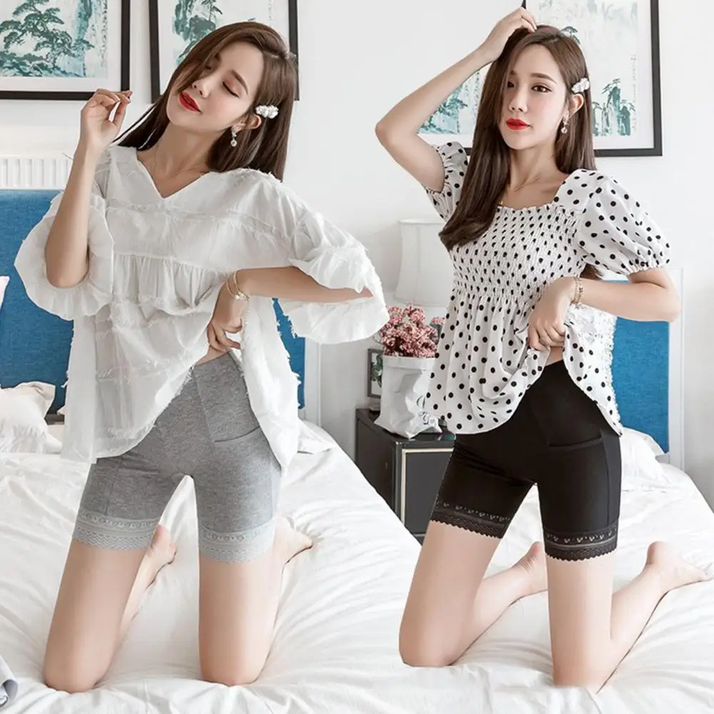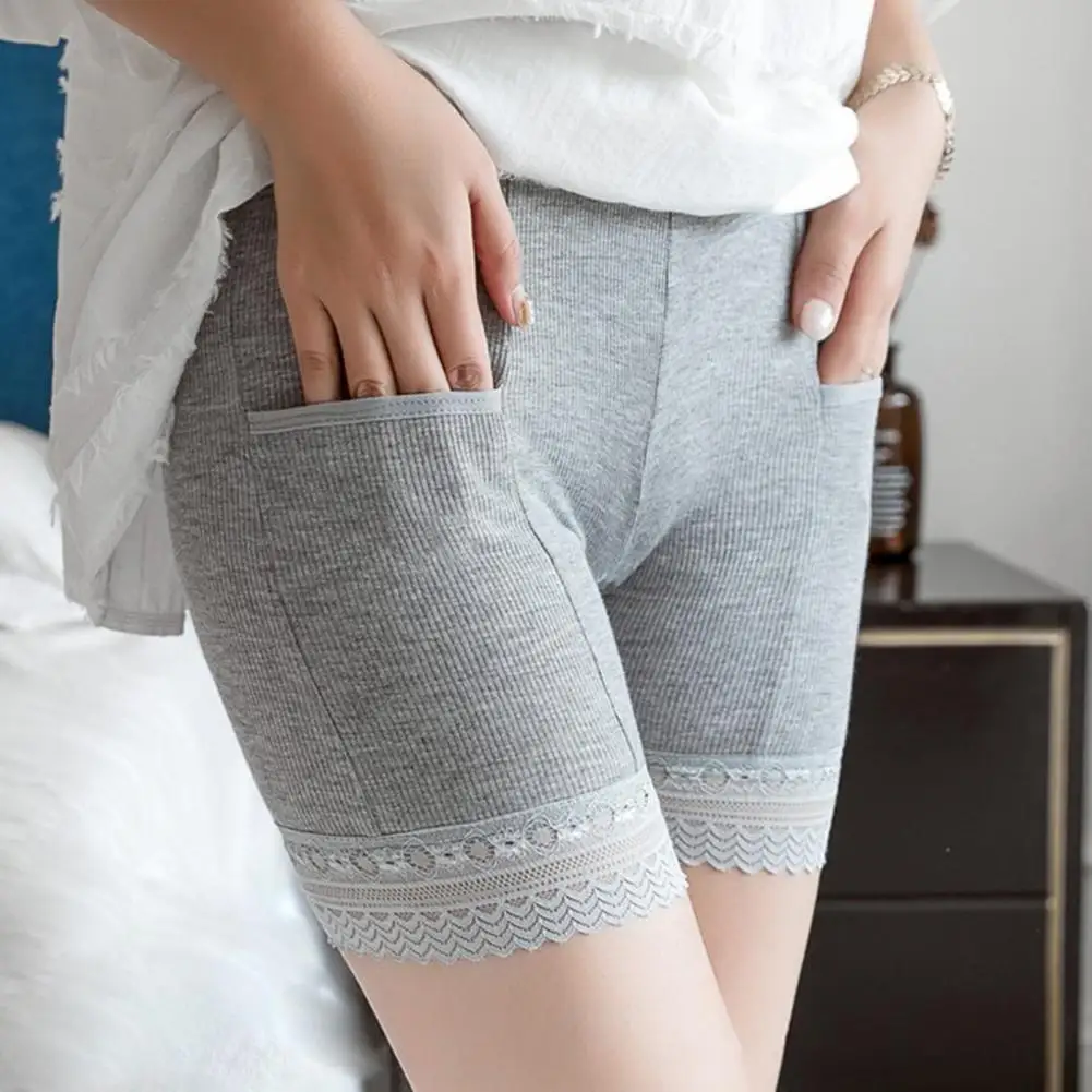 High-Waist Elastic Waistband Safety Shorts Lace Stitching Pockets Skinny Women Seamless Ribbed Slim Bottoming Shorts Summer Soft