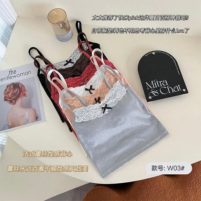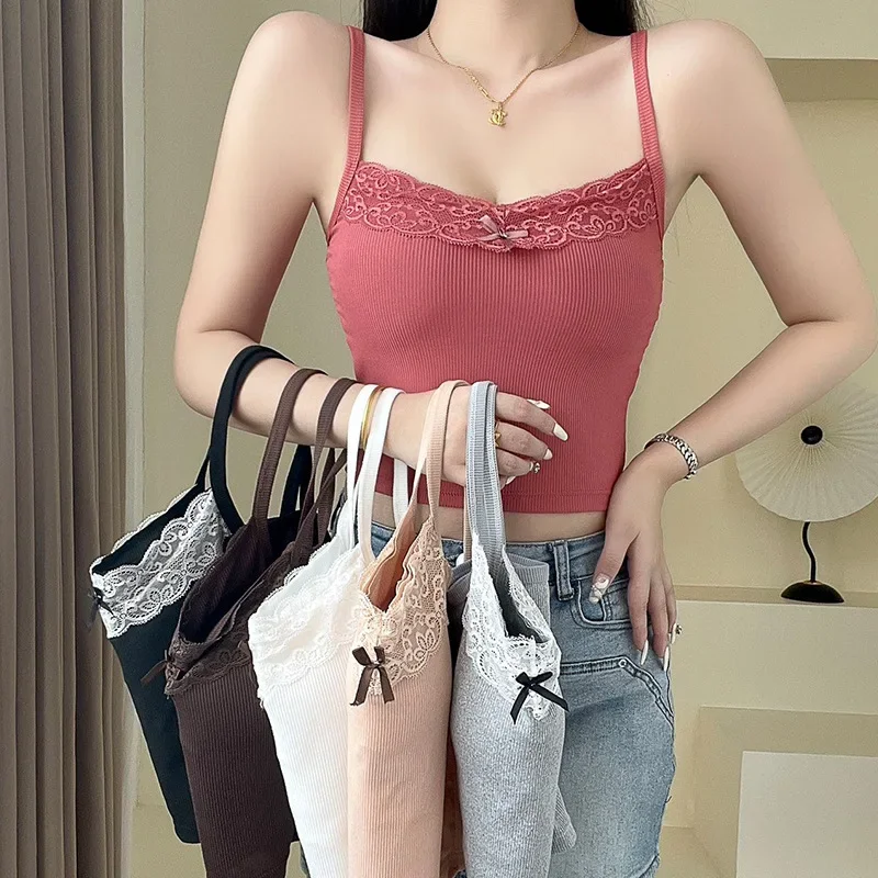Bow Decoration Sexy Lace Gray Camisole for Women with Breast Pads for Inner Wear and Outer Wear Short Slim Fit Drop Shipping