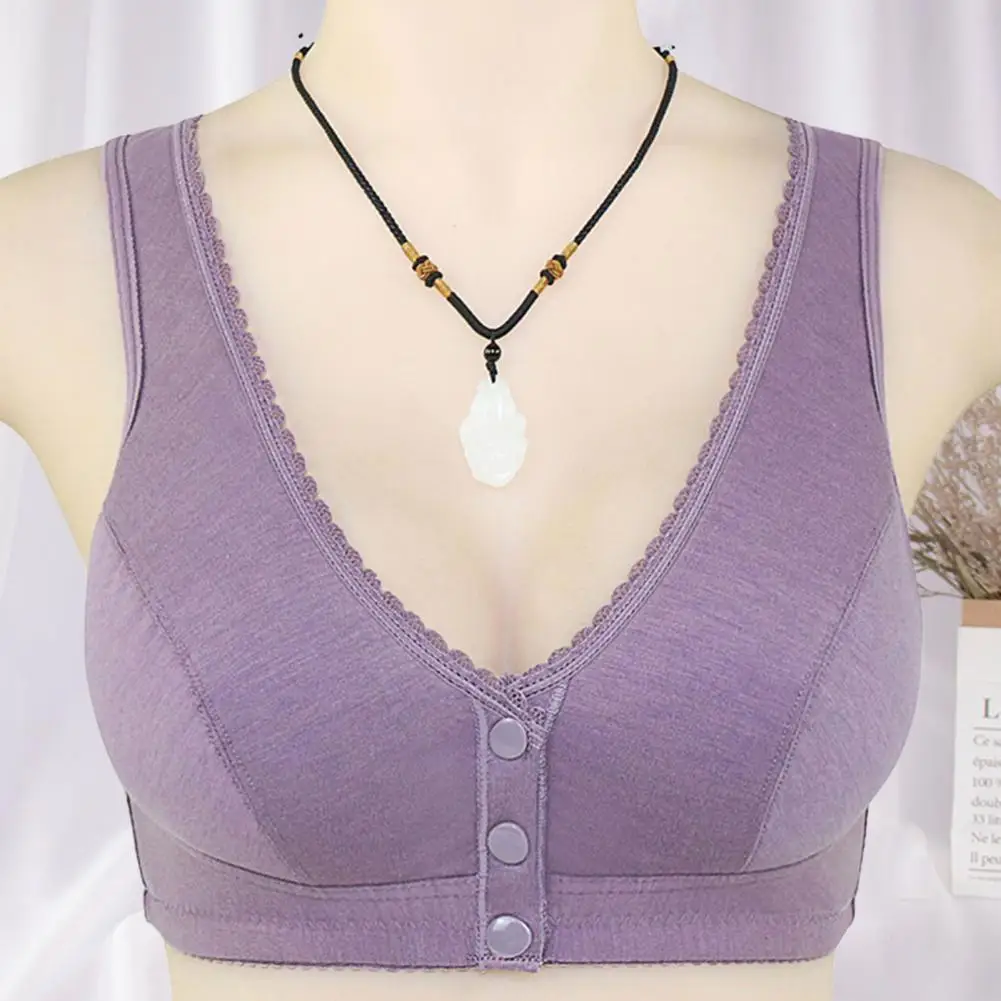 Women Bra Front Button Closure Soft Elastic Thin No Wire Bra Lace Soft Wide Shoulder Strap Breathable Mid-aged Women Mother Bra