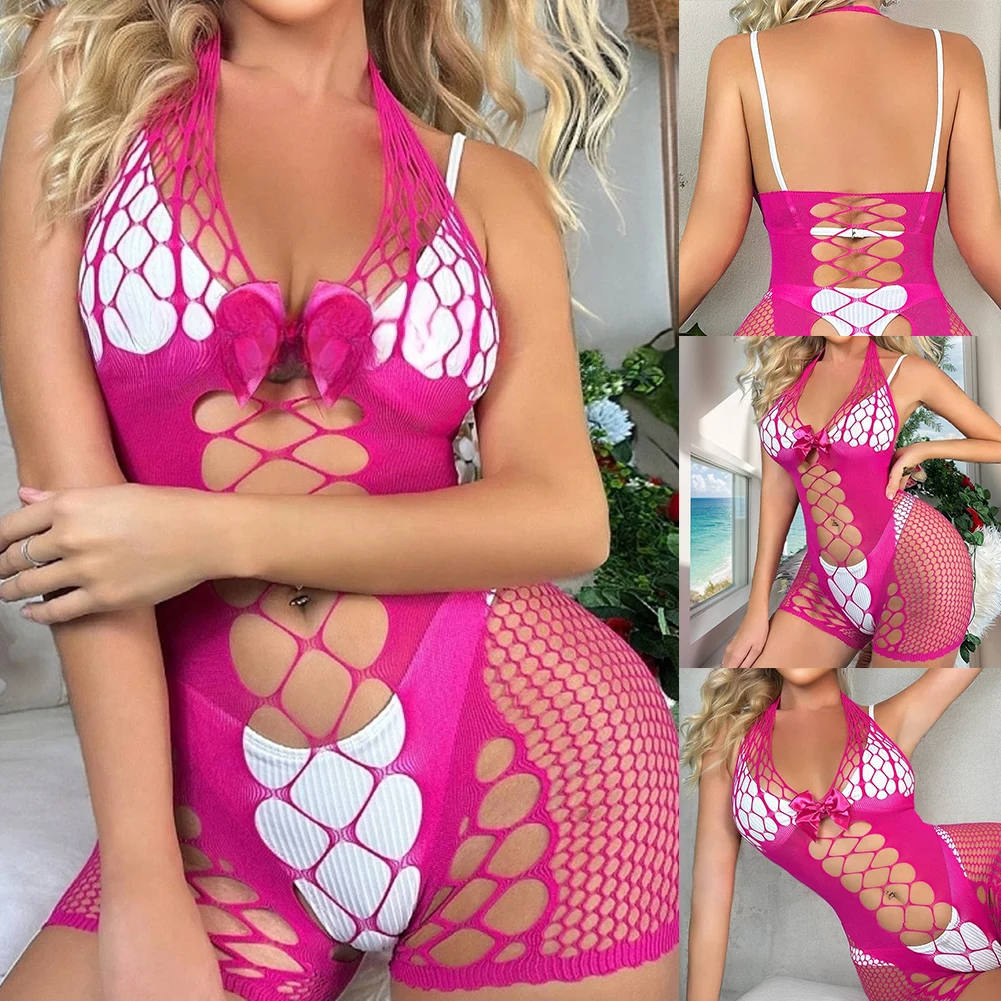 Name | Womens Sexy Jumpsuit Suspenders Halter Neck Ripped Backless Bow Hollow Out Women's Nightgown Set Sex Outfits Lingerie Home |