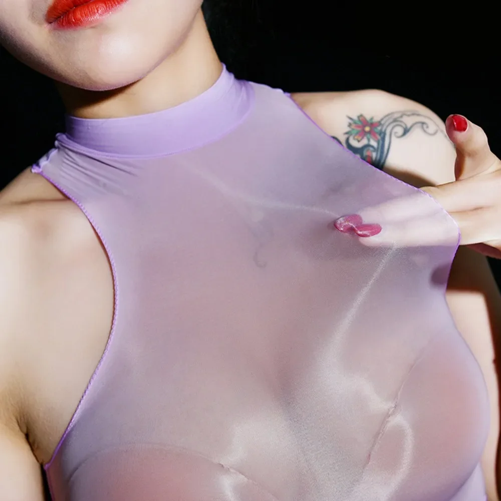 Womens Tank Tops See-Through Exotic Underwear Oil Glossy Shiny Sheer Halter Crop Top Bra Vest Sexy Seductive Sleeveless Bralette