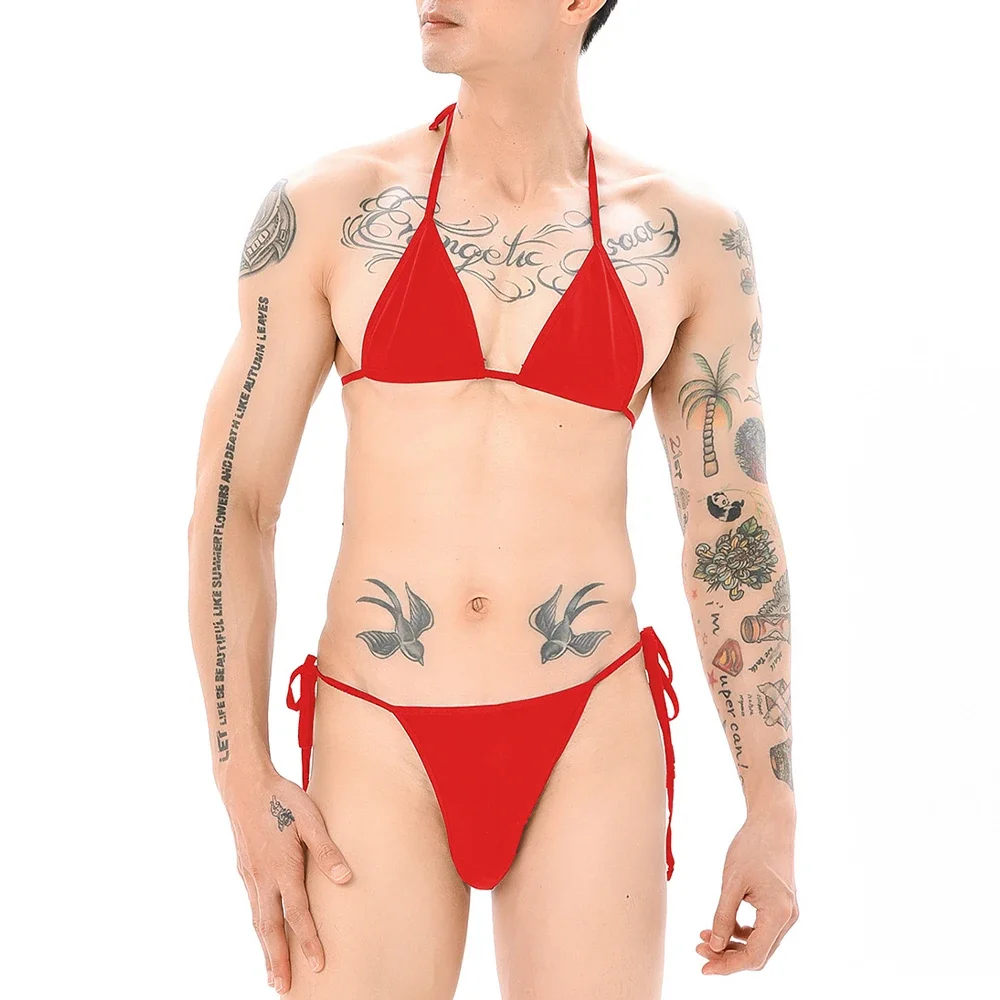 2pc Sexy Men Sissy Lace-up Bras Briefs Set Low Rise Underwear Breathable Lingerie Tops Panties Nightwear Man Exotic Bikinis Sets