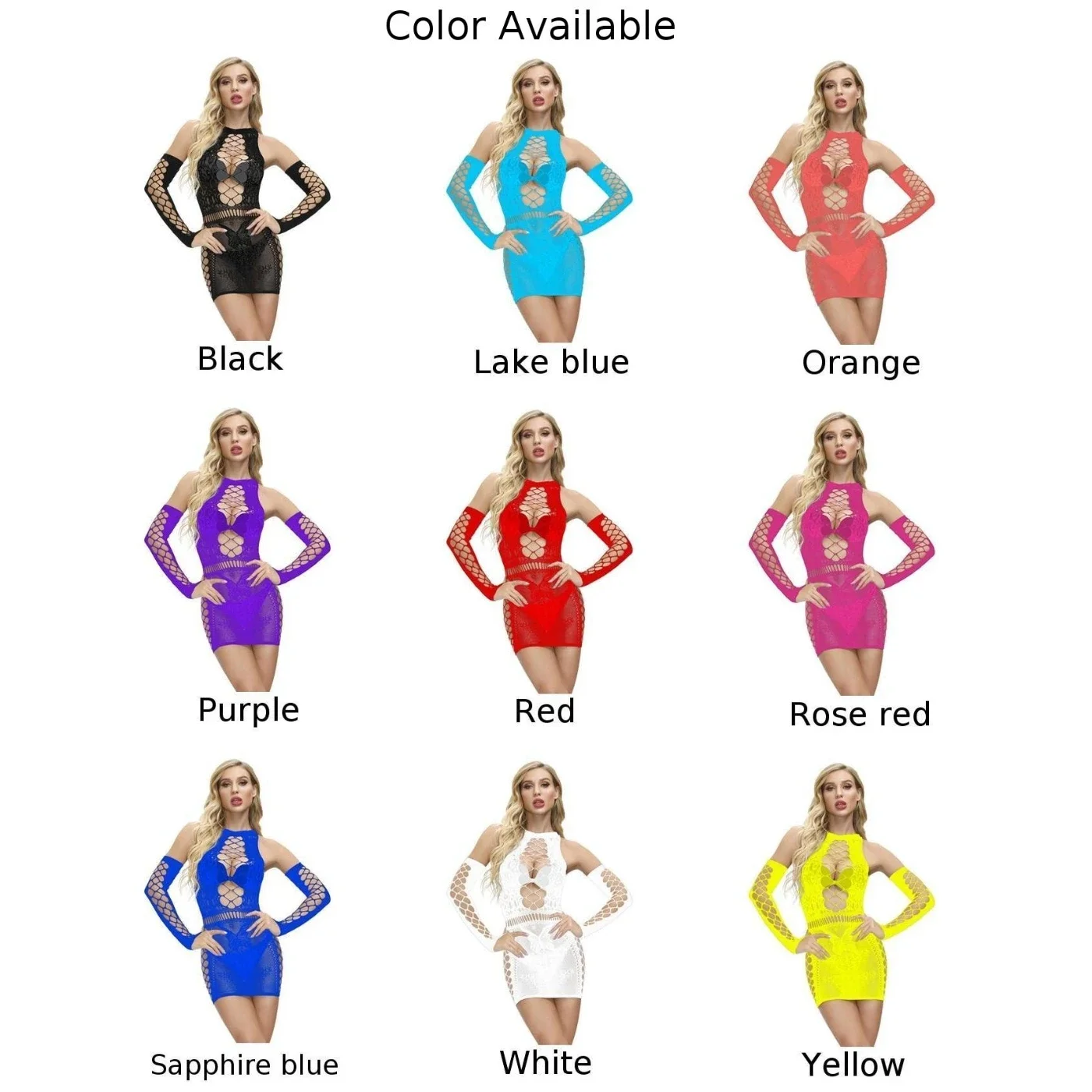 Sexy Hollow Out Women\'s Erotic Fishnet Lingerie Stretch Babysuit Hollow Out Bodycon Mini Dress Club Solid Color Classic Wear