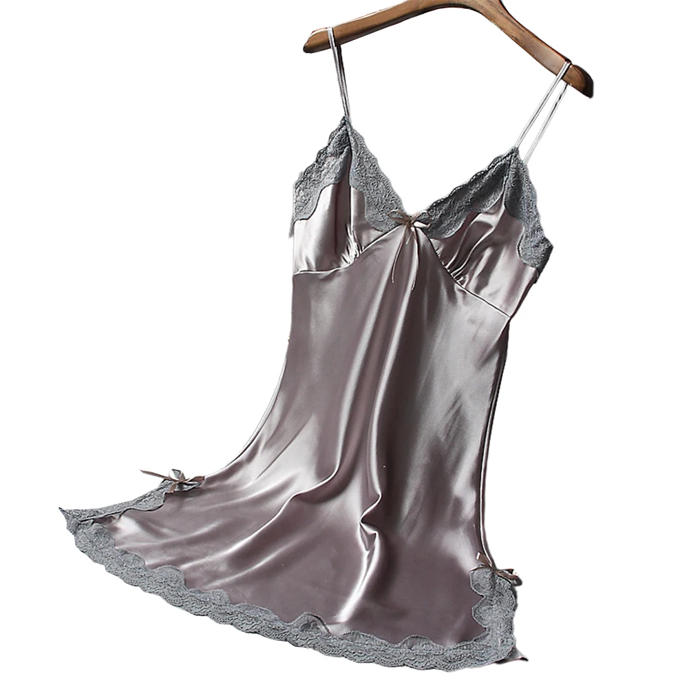 Women Satin Skin-friendly Comfortable Nightdress Sexy Lace Bowknot Pajamas Deep V Neck Thin Straps Robe Dress Soft Sleepwear