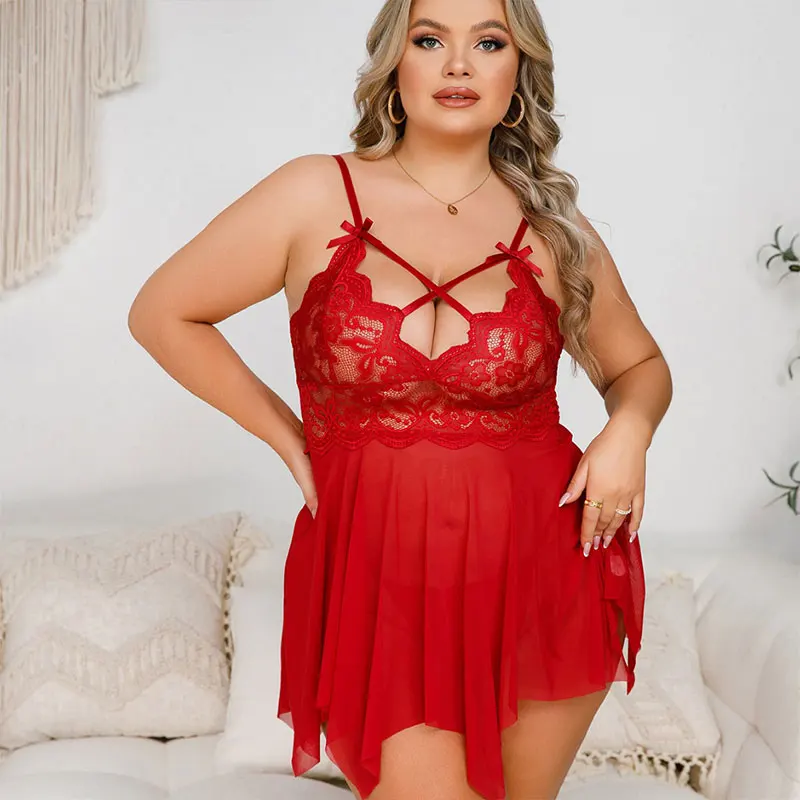 Plus Size Women's Nightgown Sexy See-through Tulle Comfortable Pajamas Set Fat MM Halter Lace Splicing Erotic Temptation Dresses