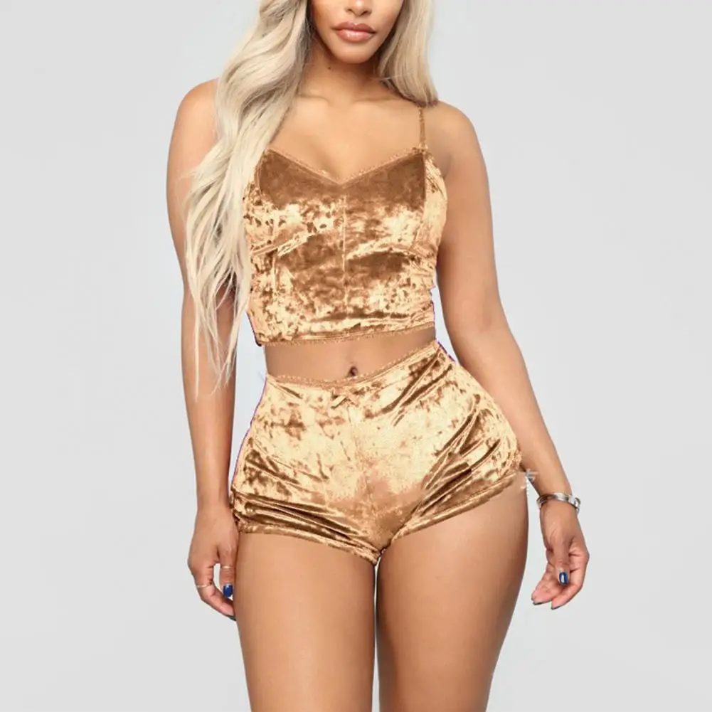2 Piece Spaghetti Strap Women Pajama Sets Nightwear Sexy V Neck Crop Top Shorts Set Women Solid Color Backless Pajama Sleepwear
