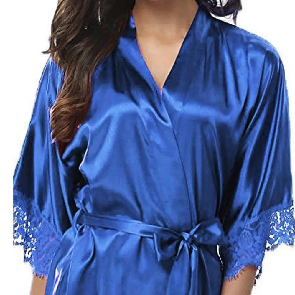 Women Bathrobe Solid Color Belt Cardigan Lace Lady Pajamas Smooth Lady Sleeping Gown Sleeping Robes Sexy Sleepwear For Spring
