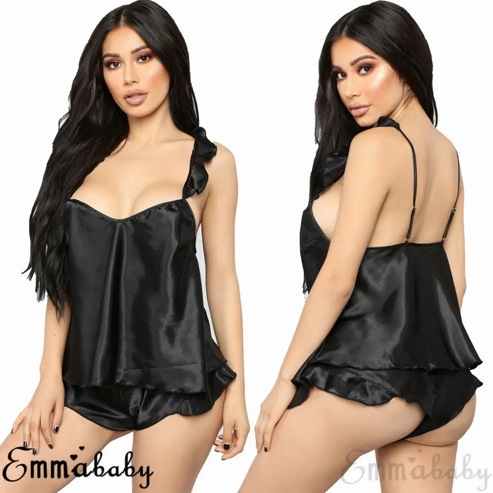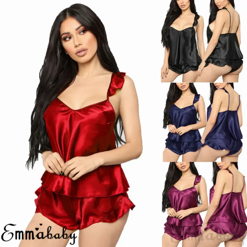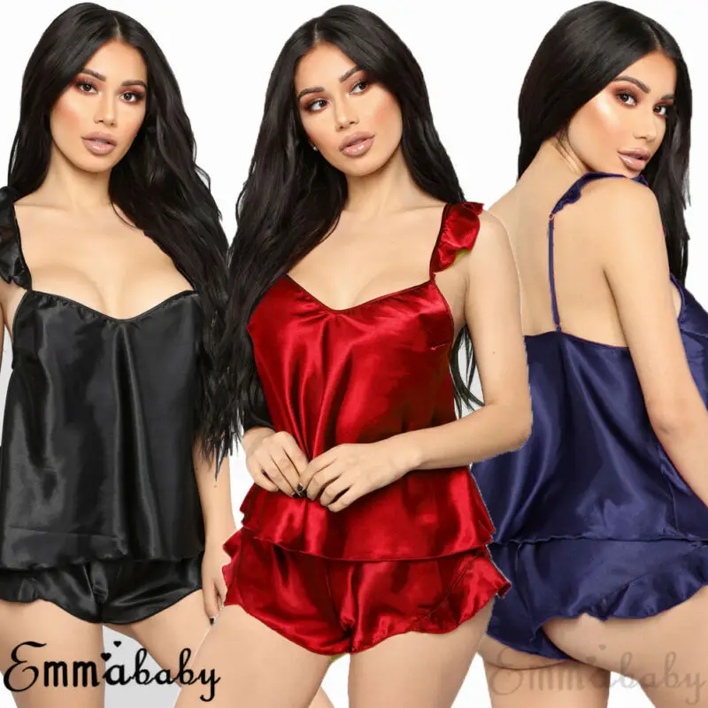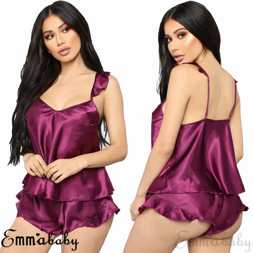 2pcs Women Silk Satin Lingerie Pajamas Set Sleepwear Tank Tops Shorts Babydoll Nightwear Women Nightwear Sleepwear