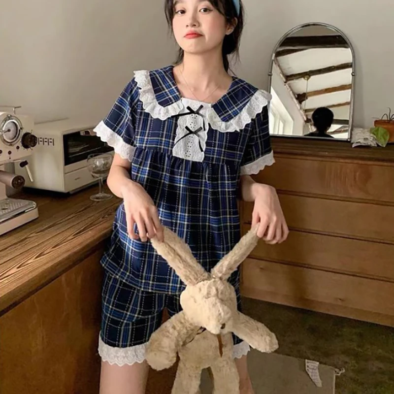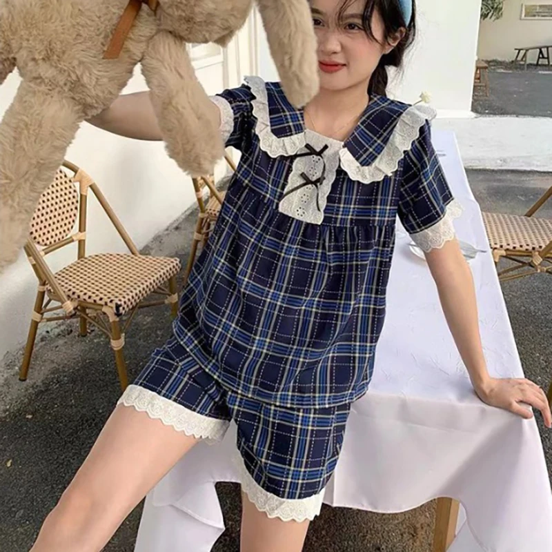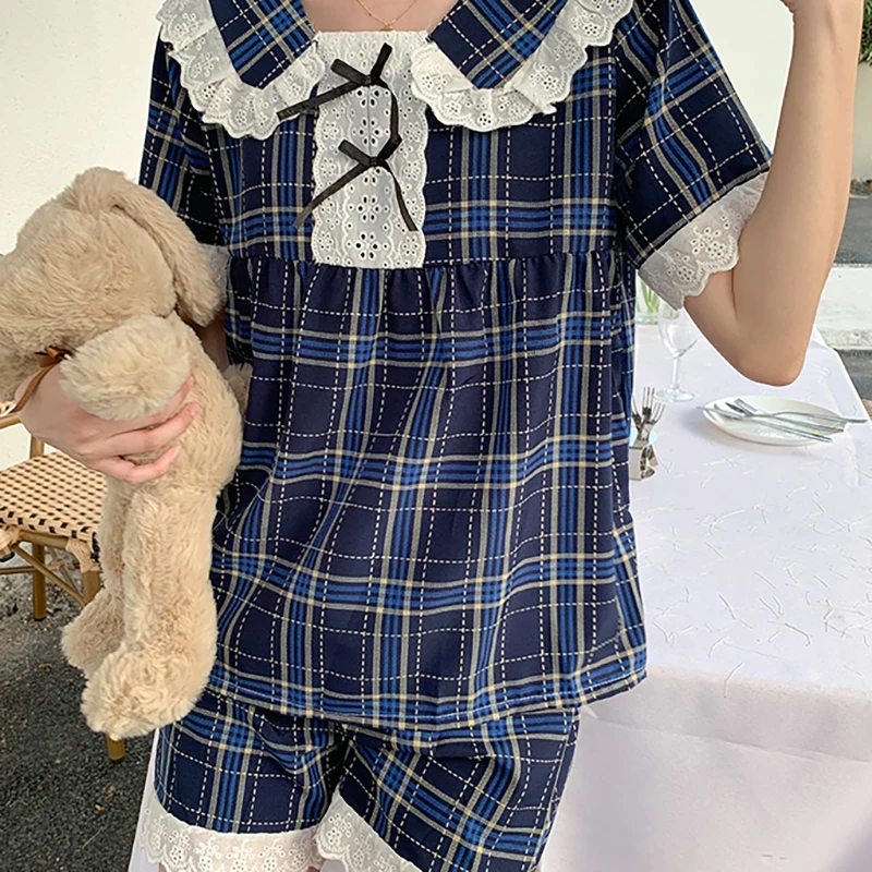 Lace Plaid Sleepwear Women Pajama Shorts Sets Summer Suit 2 Pieces Loungewear