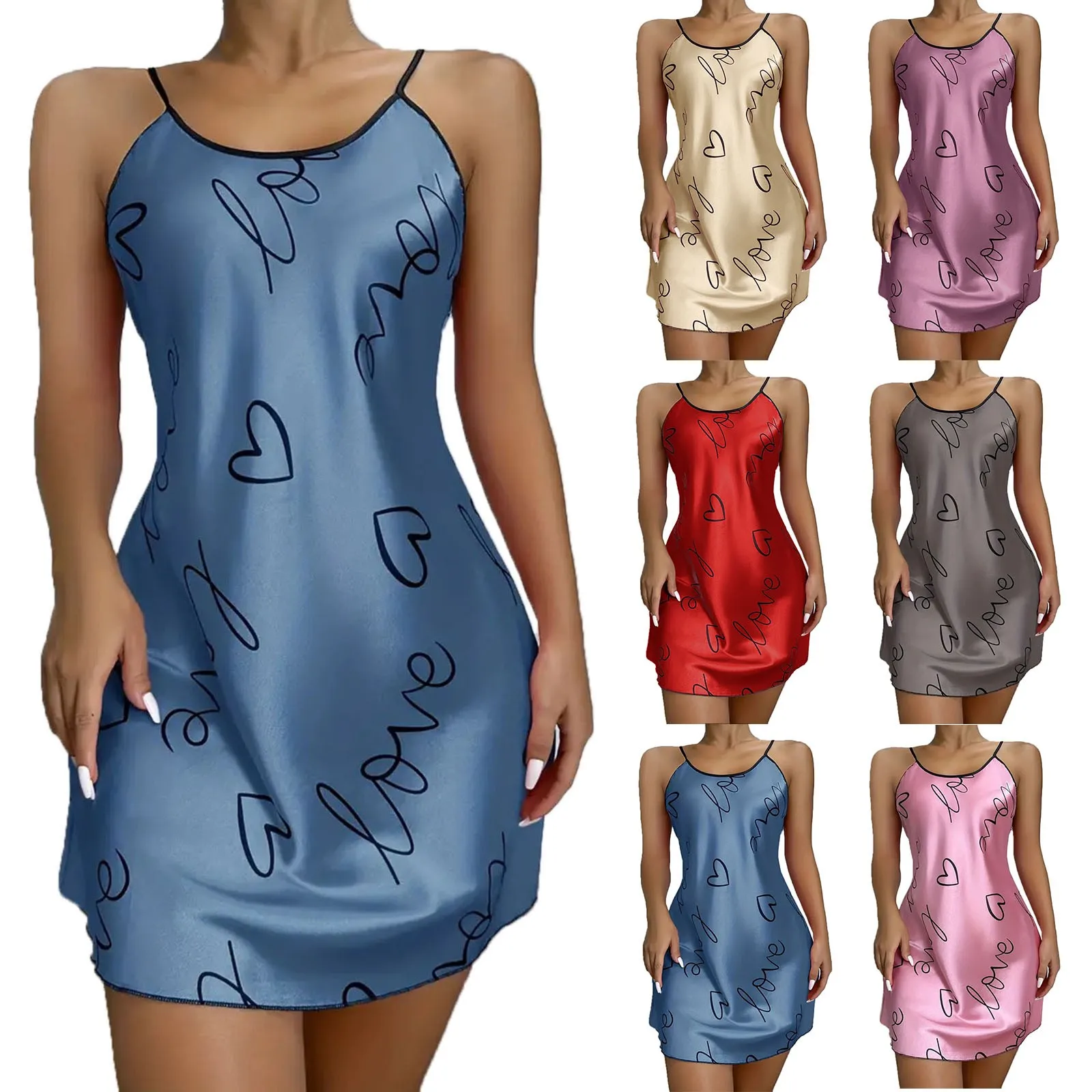 Women Sexy Sweet New Ice Silk Pajamas Sling Nightdress Open Back Elegant Romantic Heart Print Sleeveless Sleepwear Sleep Dress