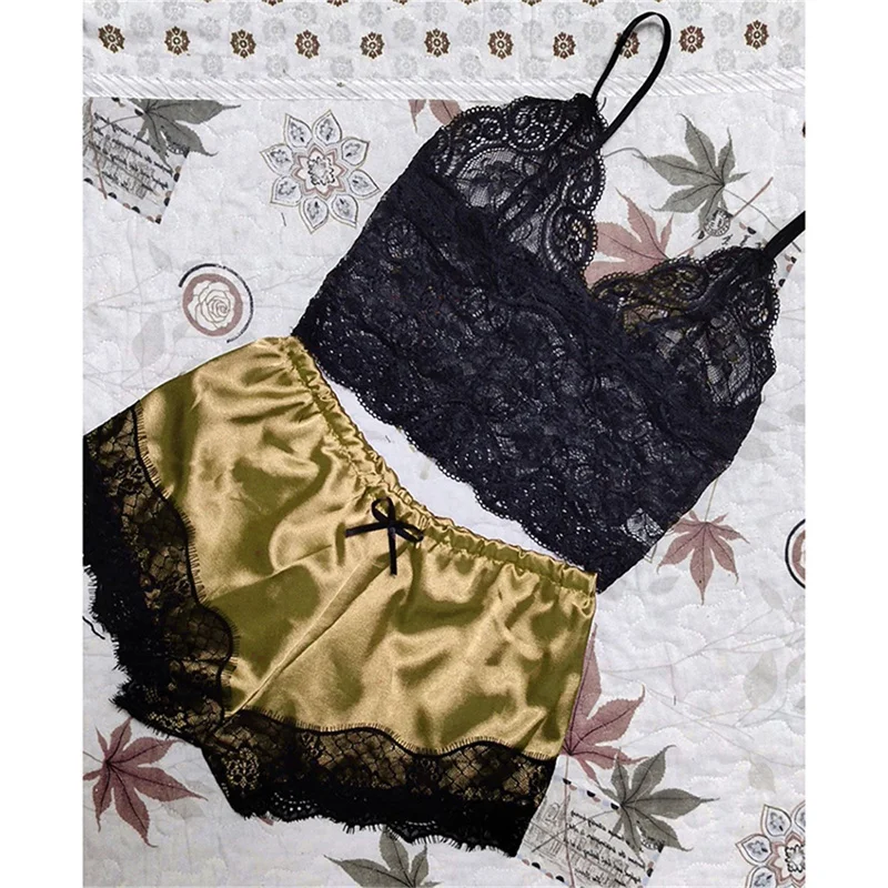 Women Lace V Neck Pajamas Set Lingerie Sleeveless Nightwear Crop Women's Sleepwear Sexy Satin Pajama Set Top And Shorts