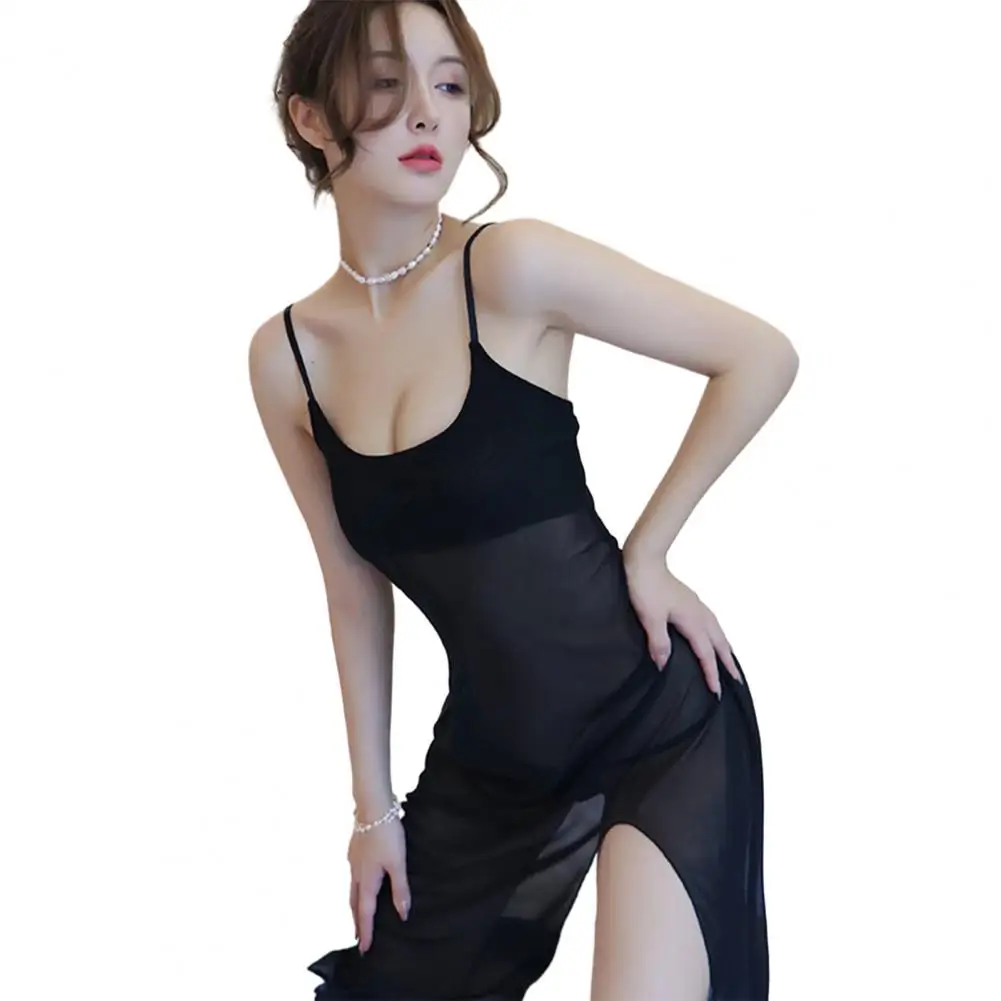 Sexy Summer Women Pyjama Set Night Dress Underpant Side Split Solid Color Thin See-through Pyjama for Women Sleepshirts