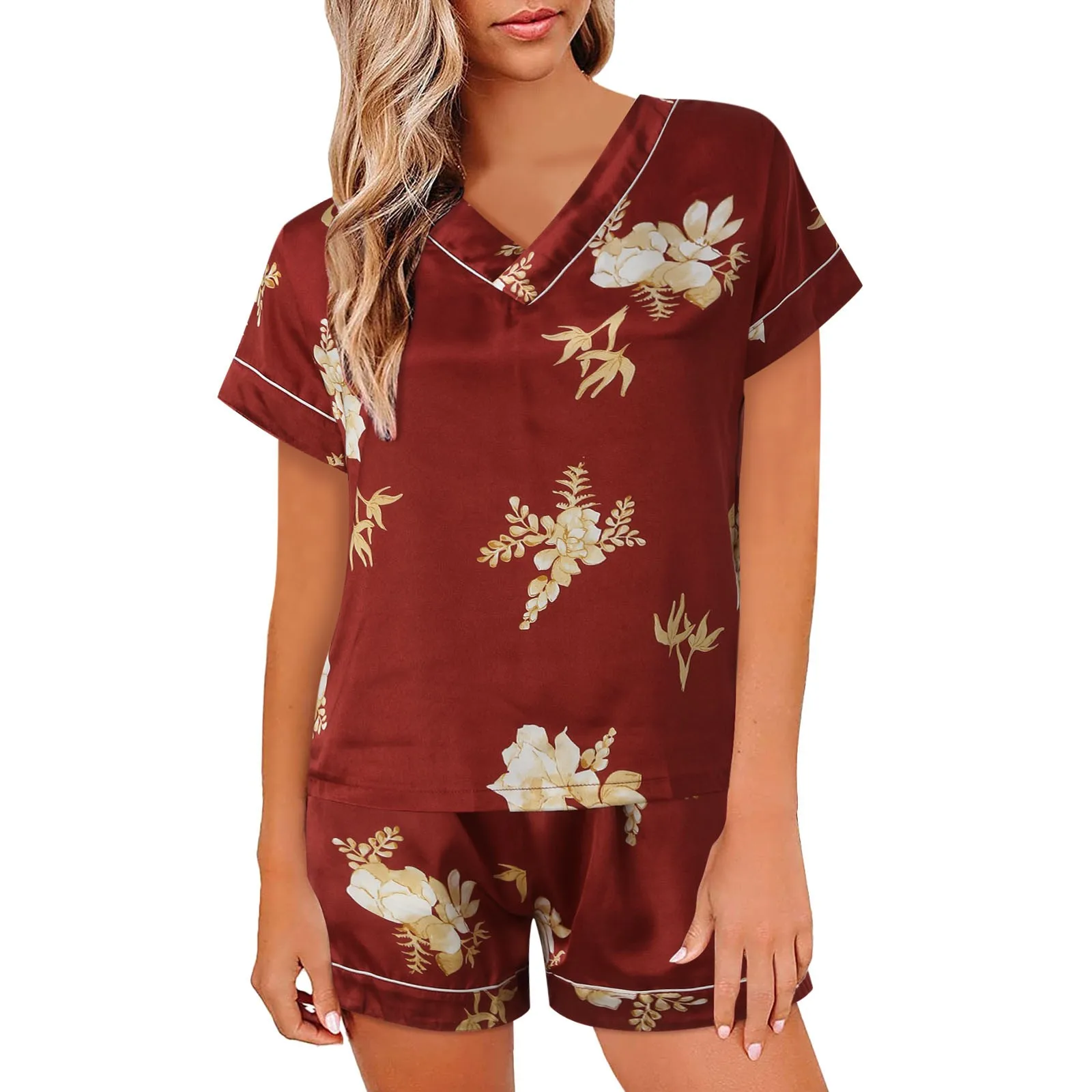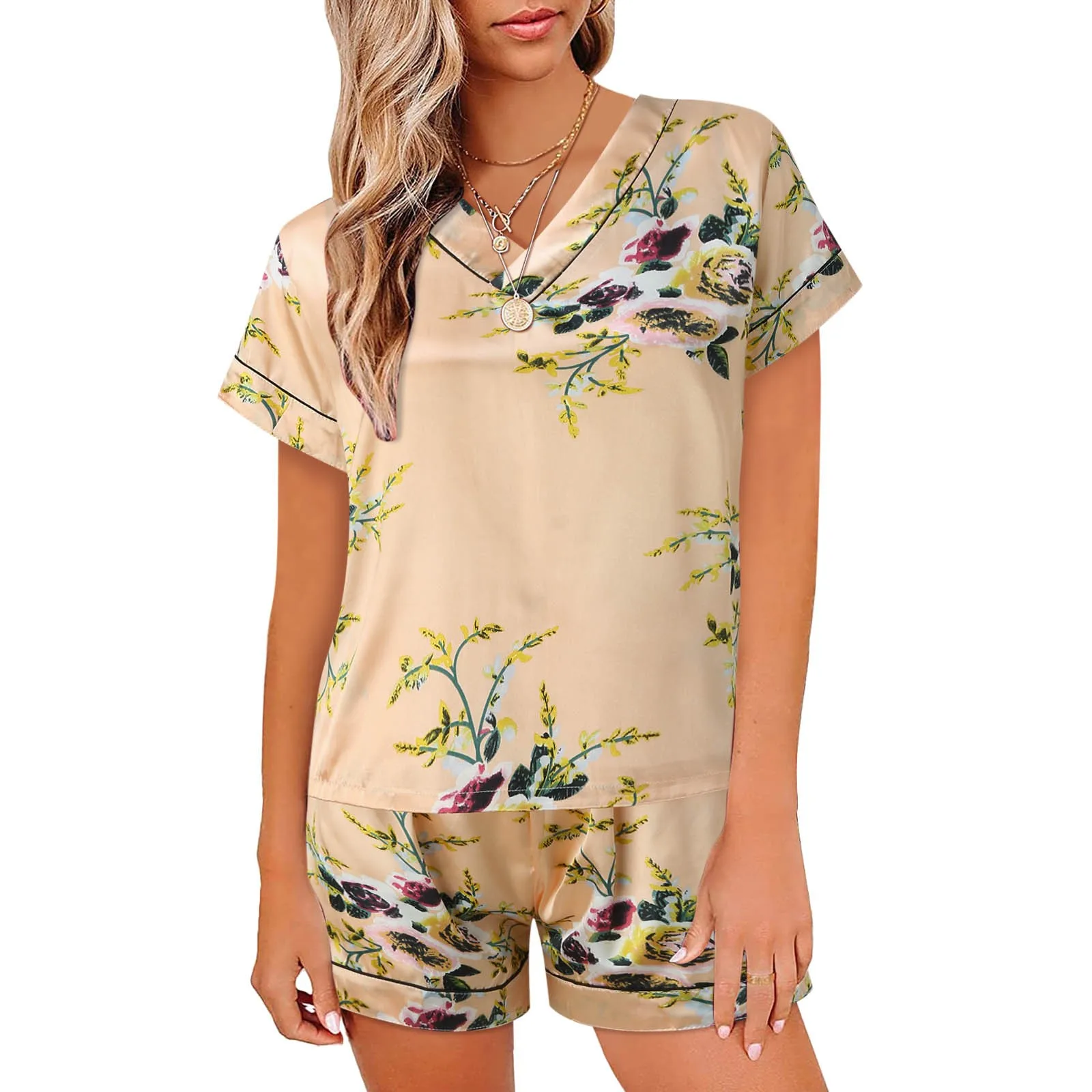 Women's Casual Short Sleeved V-Neck Pajamas Home Clothing Set 2024 Summer Comfortable Breathable Printed Pattern Pajamas Set