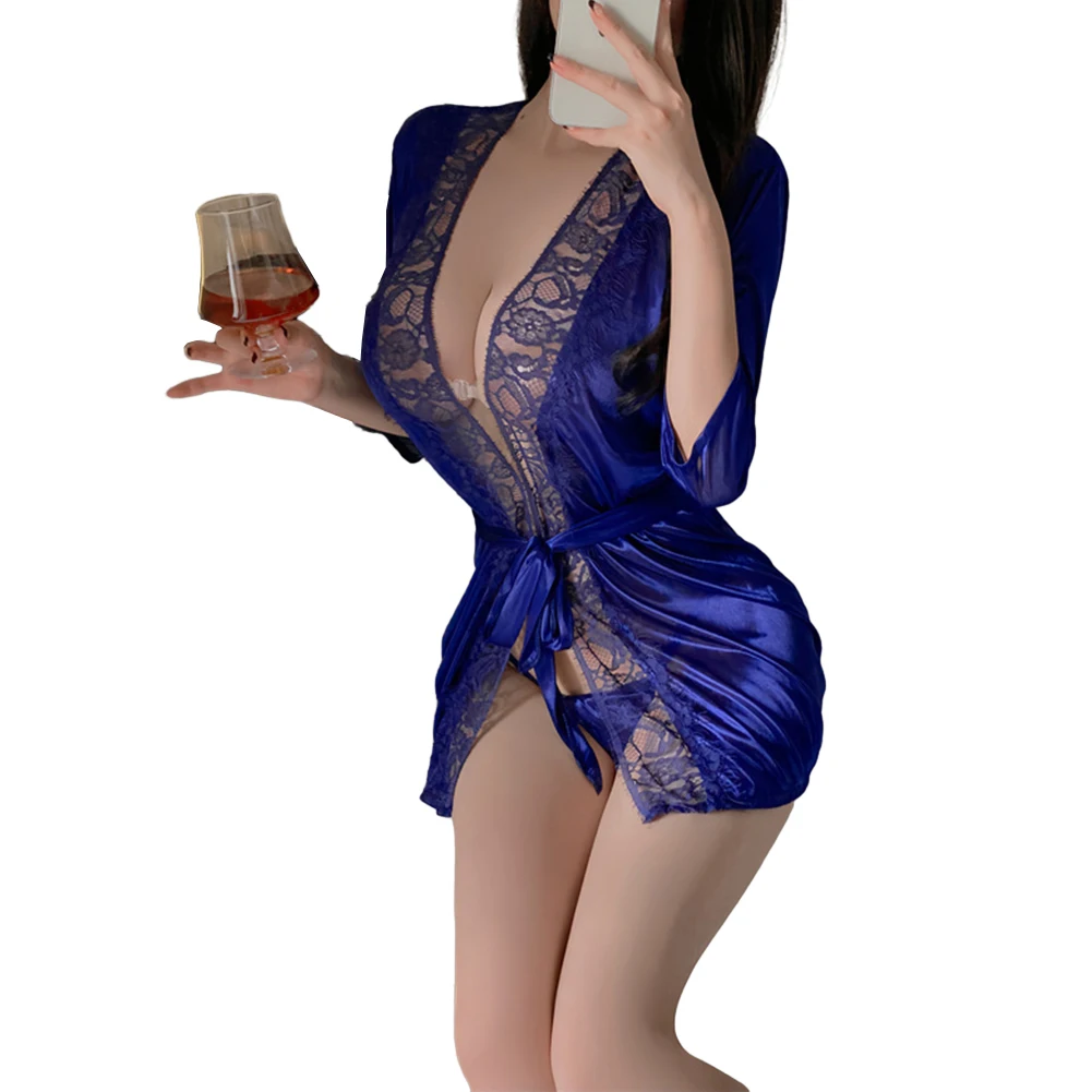 Women Sexy Robe Satin Ultra-thin Lingerie T-back Bikini Panties Set Lace Transparent Dress Mini Short Nightgown Erotic Pajamas