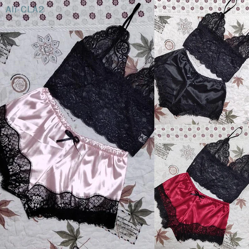 2PCS Womens Lace Sleepwear Lingerie Tops Shorts Set Babydoll Pajamas Nightwear