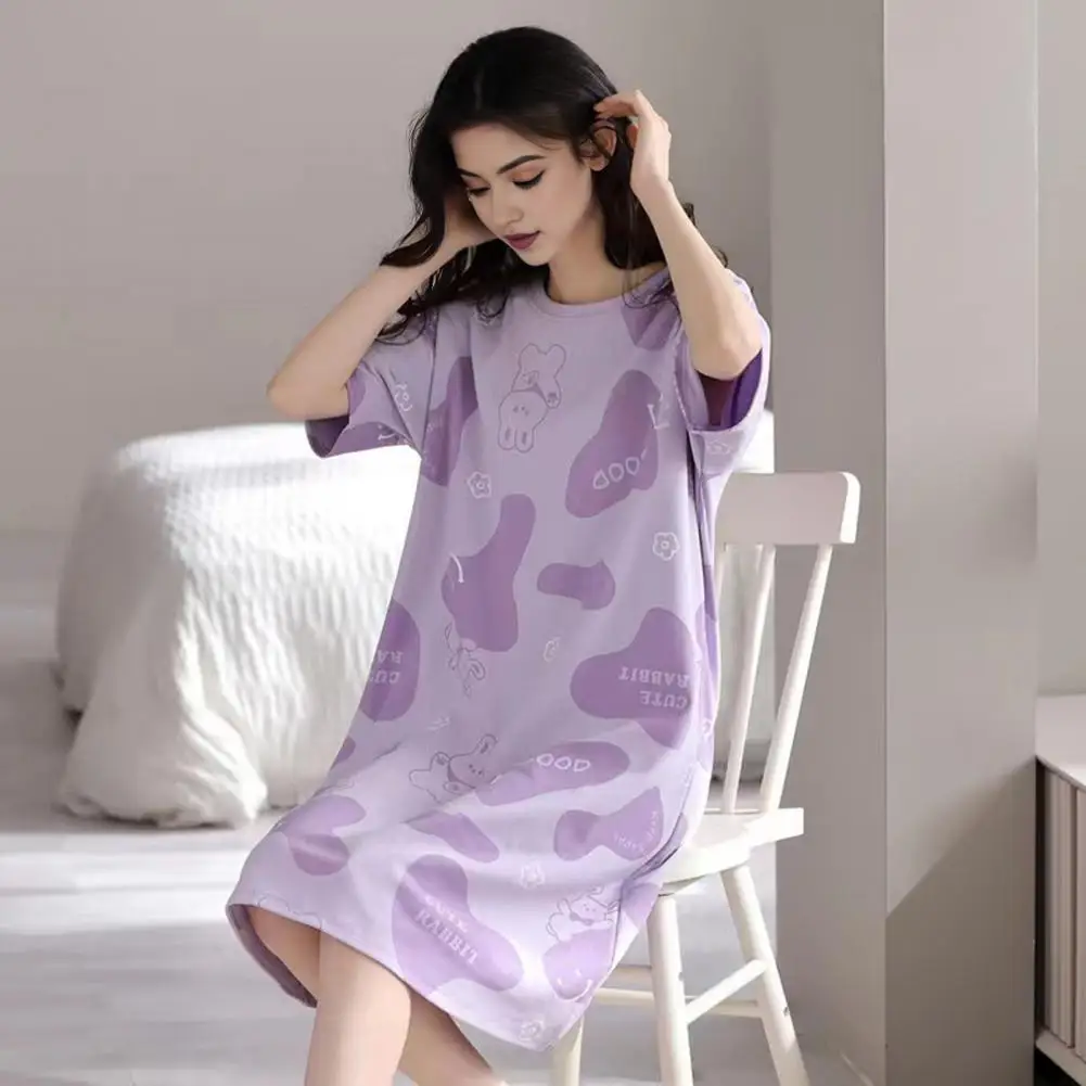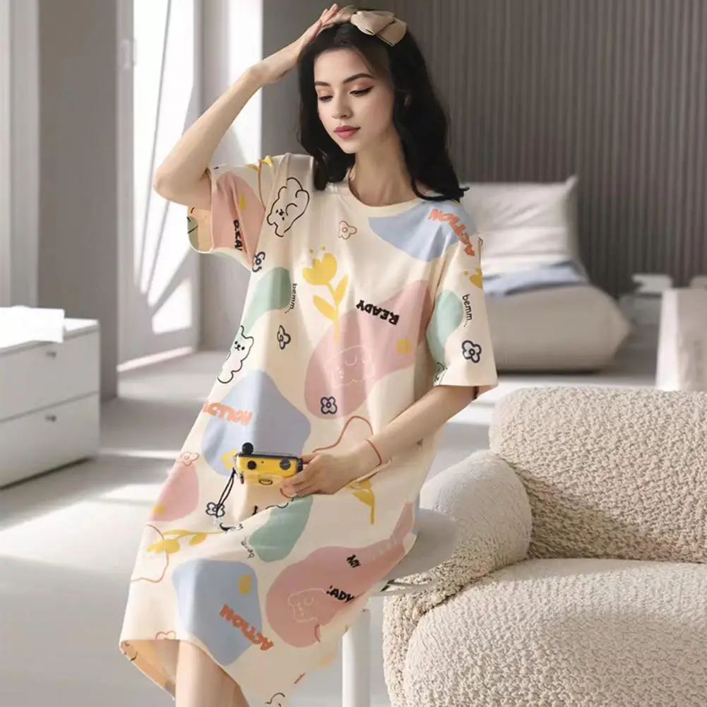 Name | Casual Home Wear Dress Cartoon Print Women's Summer Nightgown O Neck Loose Pullover Dress for Lady Sleepwear Knee Length |