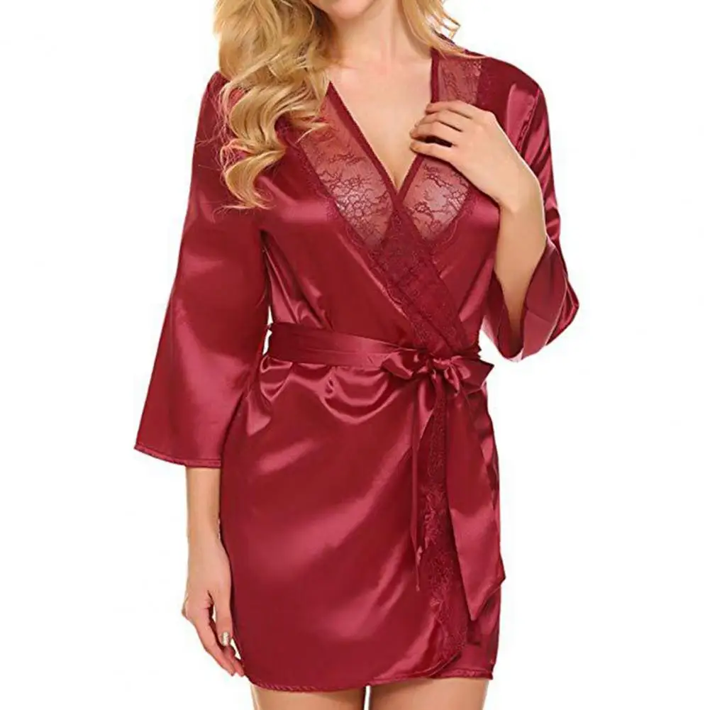 Women Sleepwear Solid Color Satin Cardigan Lace Up Tight Waist Lady Nightie Female Intimate Clothes