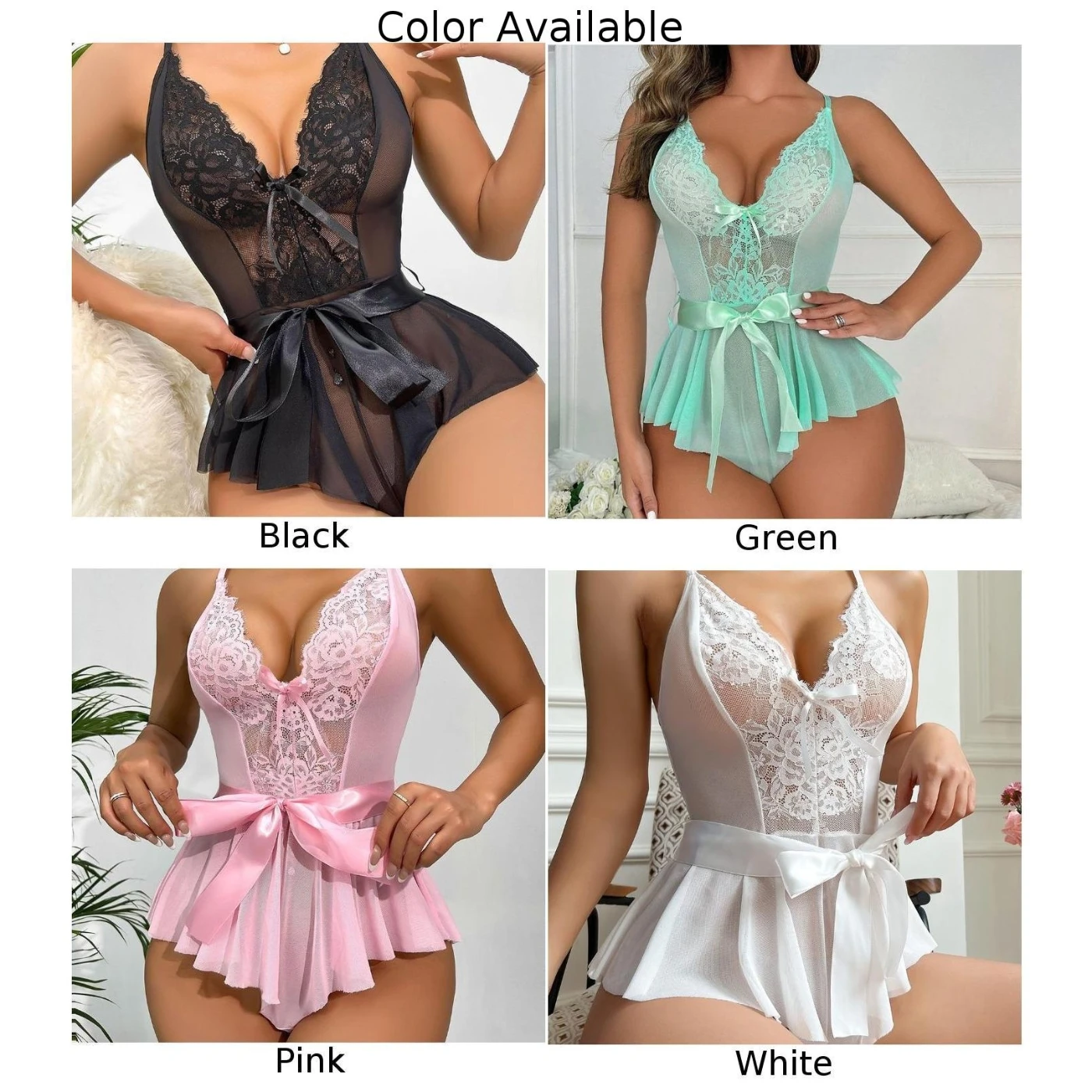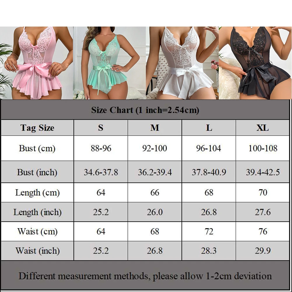Women Sexy Lingerie Deep V-Neck Lace Sleeveless Bodysuit Perspective Bow Outfits Sleepwear Nightgowns Summer Pajamas Woman Dress