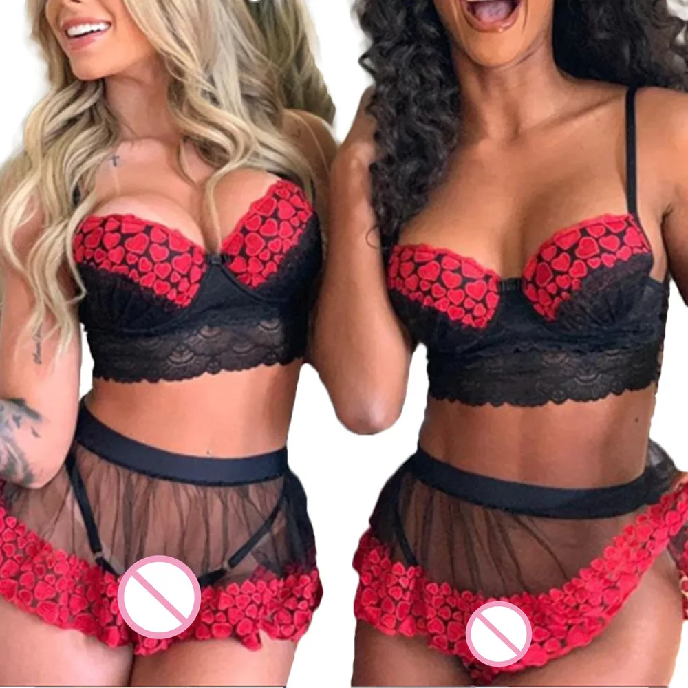 Women Sexy Babydoll Lace Bra Set G-string Panty Underwear Nightwear Heart Print Crop Top Mini Skirt Suits Sexy Lingerie