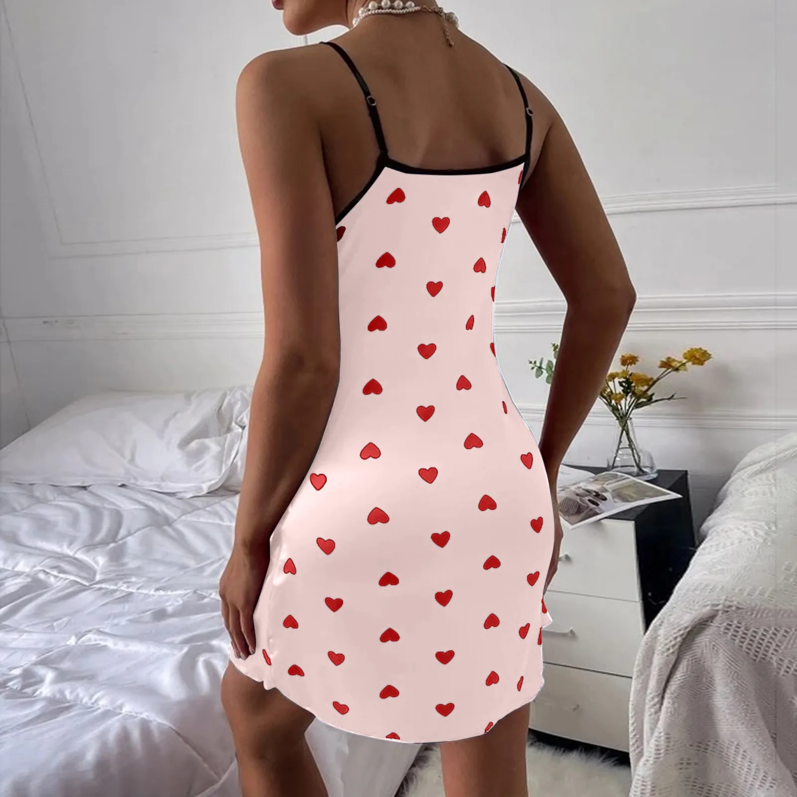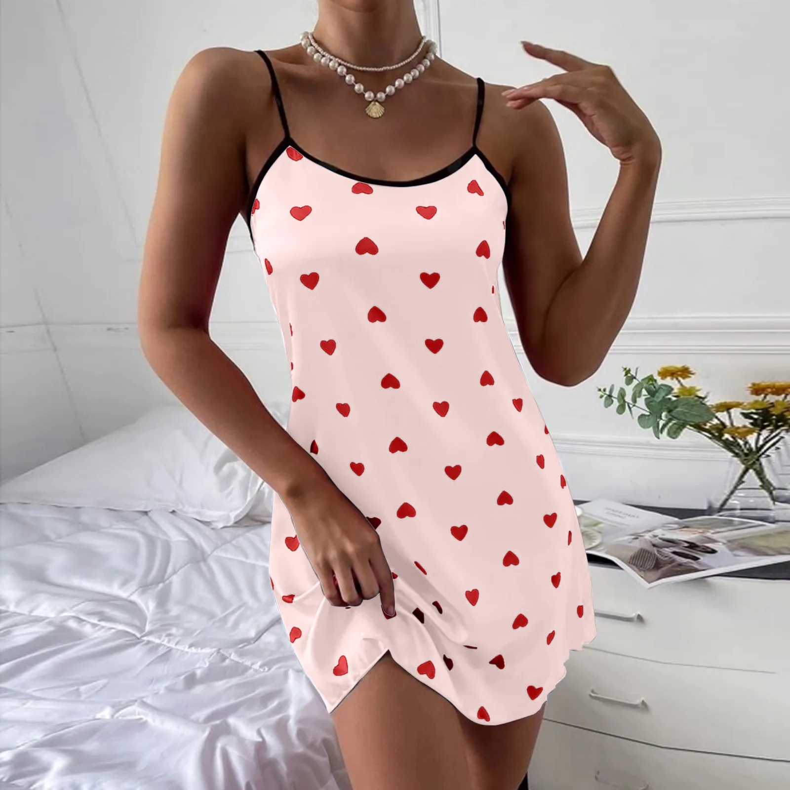 Women Nightdress Heart Print Suspenders Sleeveless Backless Slip Mini Dress Satin Underwear Sleepwear Sexy Nightdress Summer