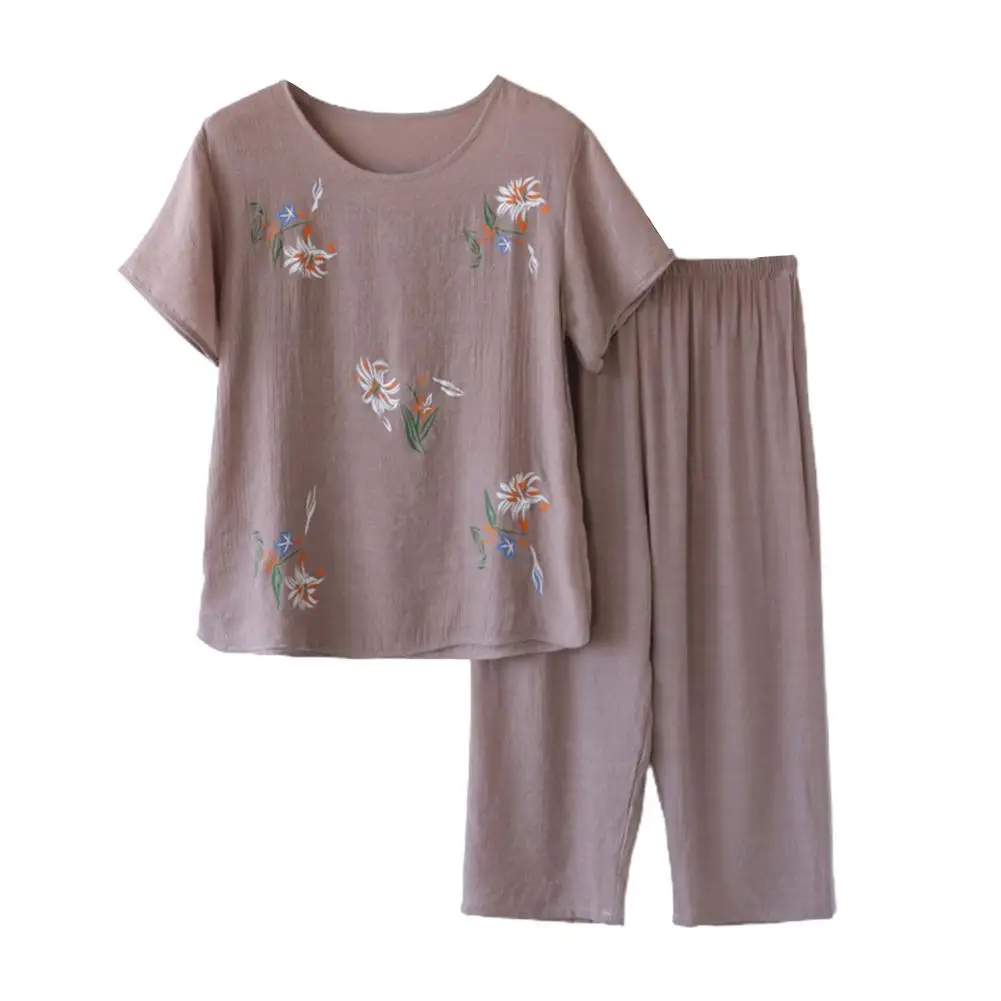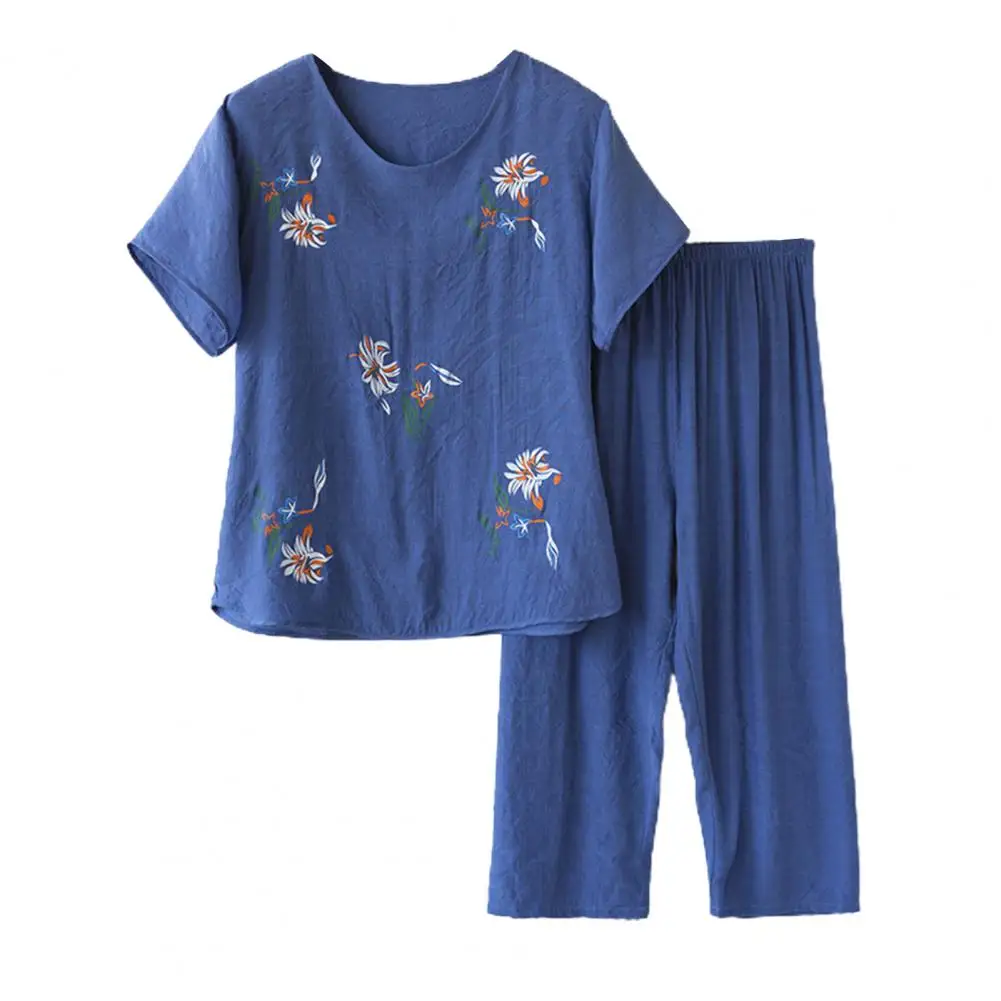 2 Pcs/Set Mid-aged Women Pajamas Set Flower Print Pleated Loose Thin Wide Leg Mother Grandmother Sleepwear Top Pants Set