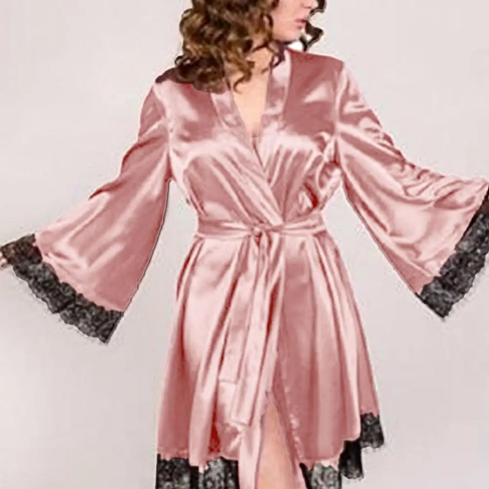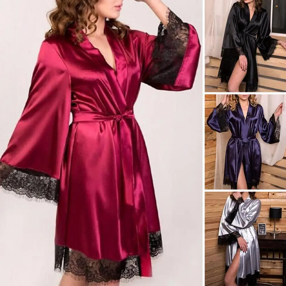 Women Nightgown Elegant Lace Trimmed Nightgown with Belt for Women Silky V Neck Sleepwear Dressing Robe for Bridesmaid Bride