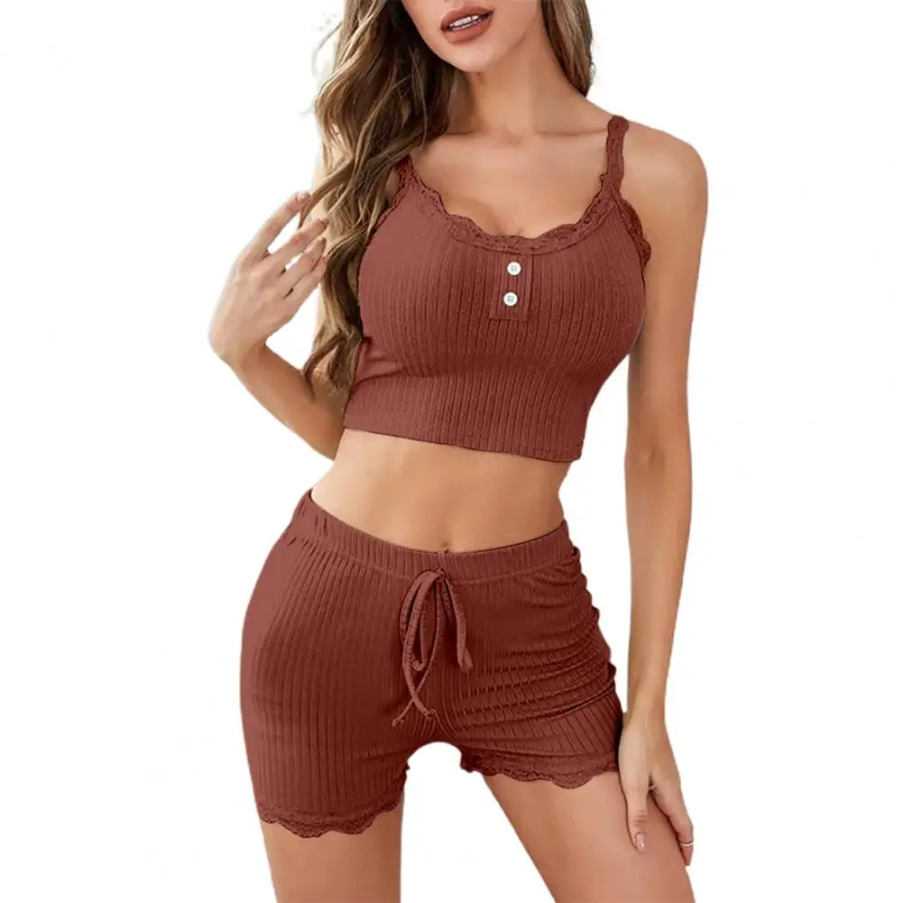 Lace Loungewear Set Elegant Lace V Neck Top High Waist Shorts Set for Women Summer Pajamas Outfit with Drastring Elastic Slim