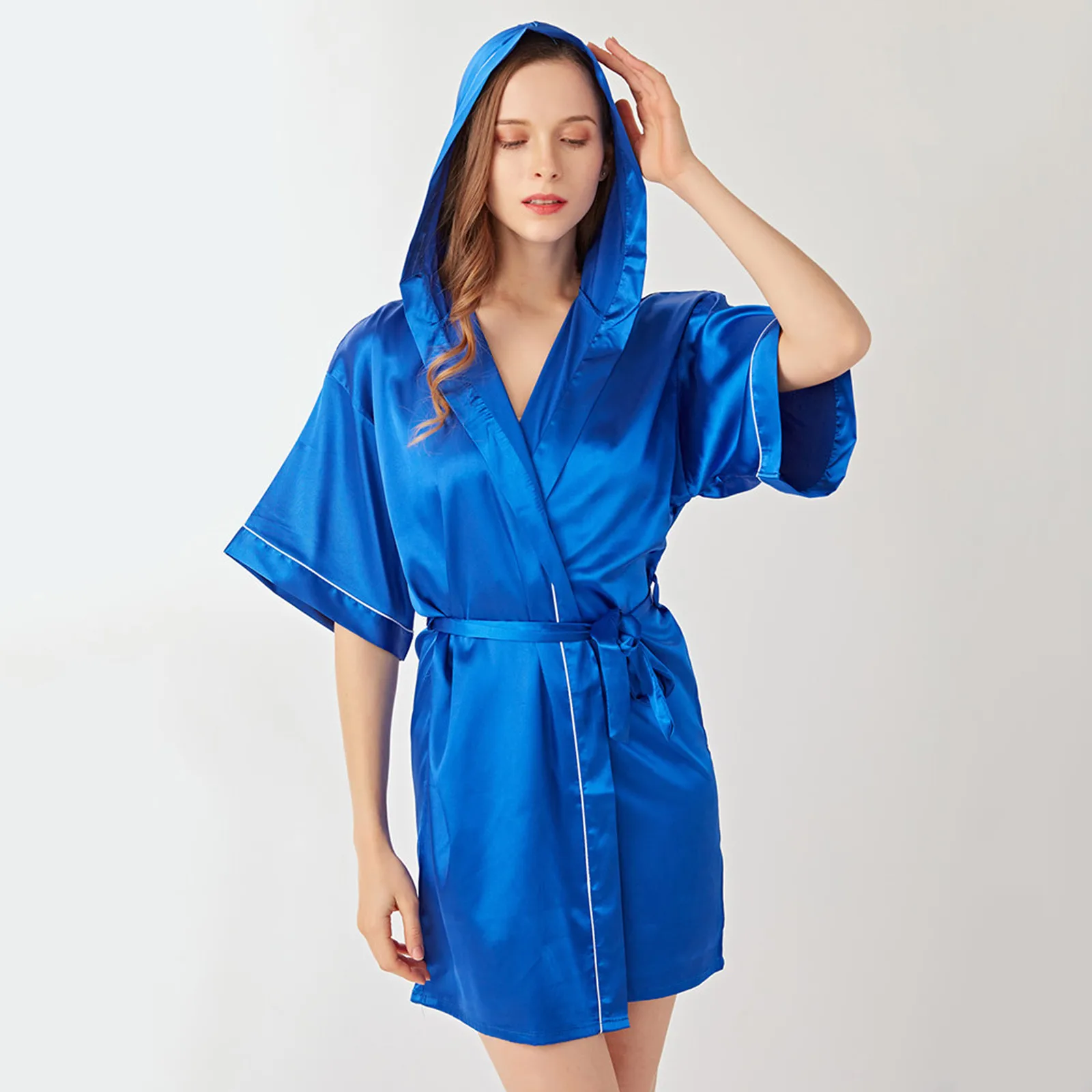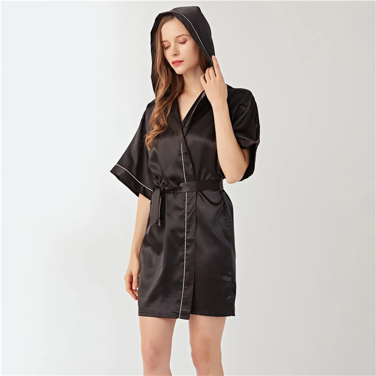 Lady Nightgown Bathrobe Women Simulation Silk Hooded Homewear Thin Cardigan Satin Kimono Short Bridesmaid Wedding Party Pajamas