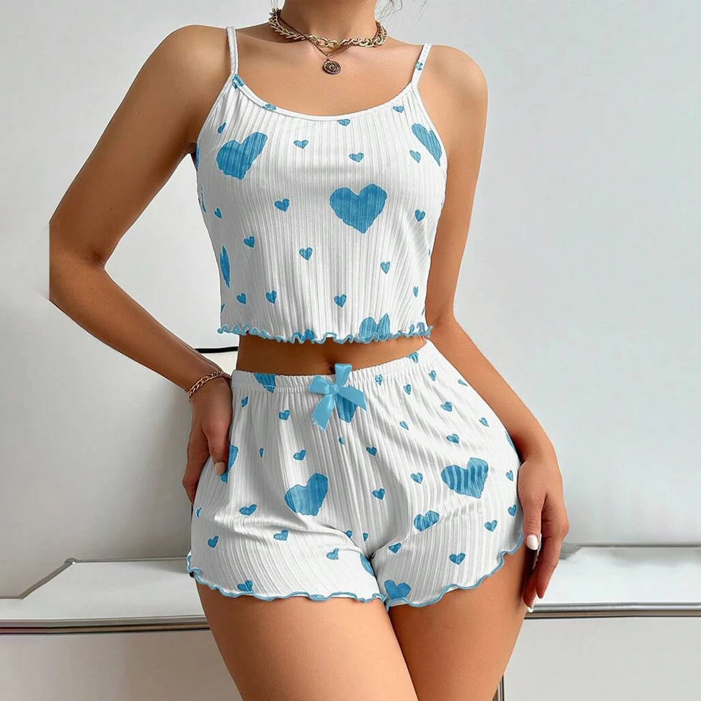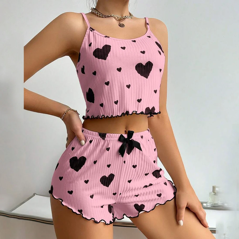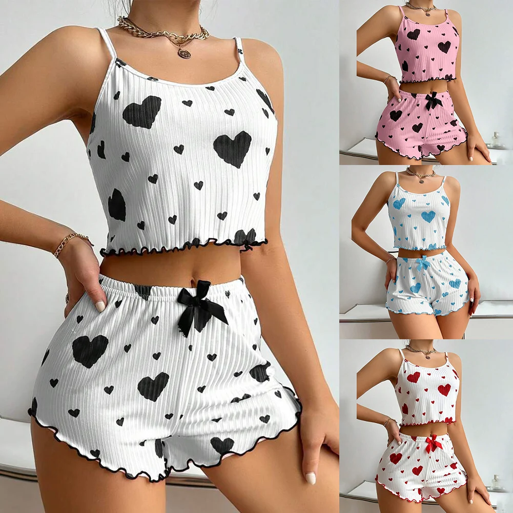 Women's Sexy Heart Print Suspender Pajamas Set Summer Sleeveless Top Shorts Comfortable Sleepwear 2 Piece Set Casual Home Suit