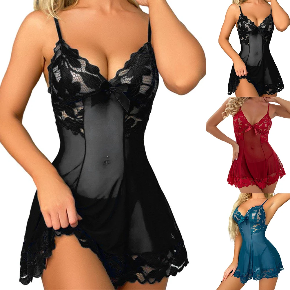 Sexy Women Nightdress Lace Low Cut Nightwear Jacquard Bowknot Mini Dress Solid Camisole Lingerie Ultra-thin Seduction Underwear