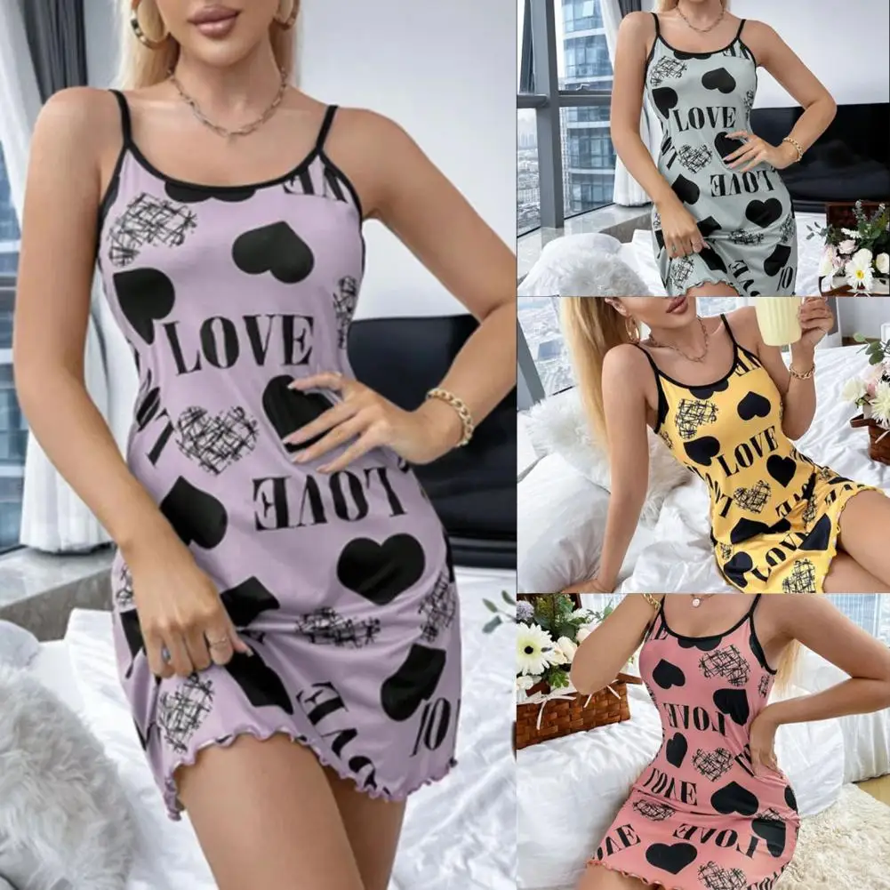 Name | Women Nightdress Heart Print Letter Pattern Sleeveless Sleepwear Backless Sleeping Scoop Neck Above Knee Women Nightgown |