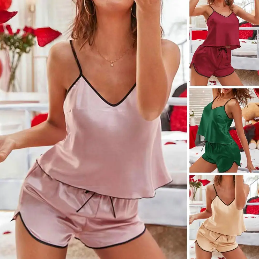 2 Pcs/Set Women Pajama Set Backless Sleeveless V Neck Top Elastic Waist Split Mini Shorts Satin Soft Female Loungewear Sleepwear