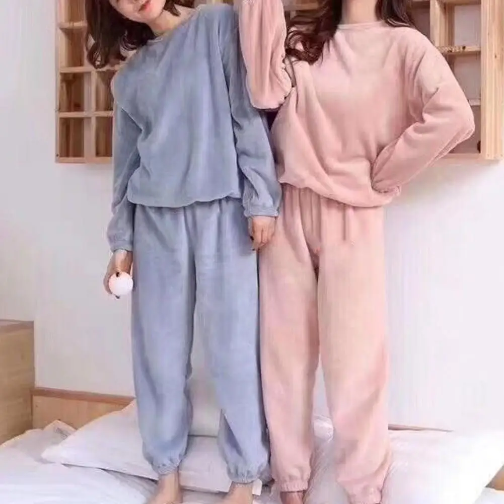 2Pcs/Set Women Pajamas Set O-neck Long Sleeve Tops Elastic Waist Long Pants Soft Coral Fleece Loungewear Set