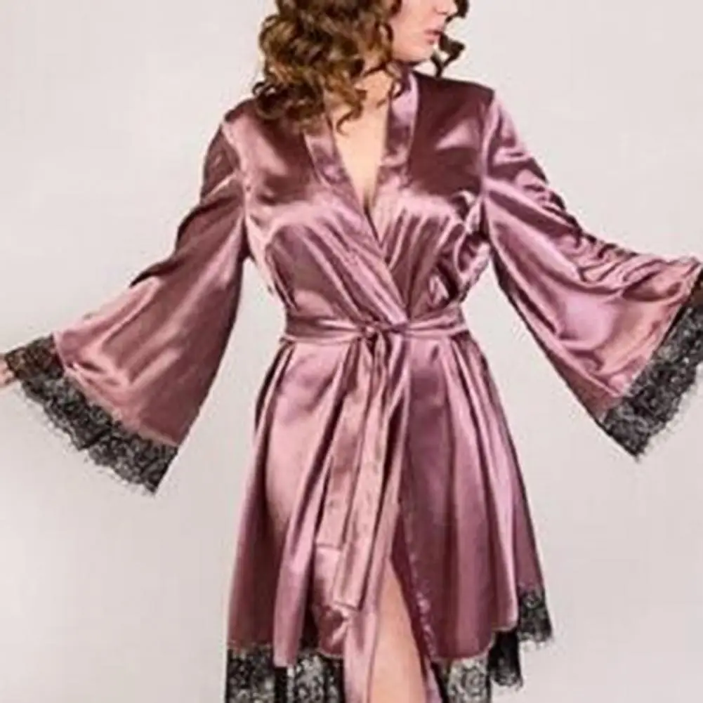 Silk Lace Nightgown Tight Waist Lace Bath Robe Women Sleepwear Long Sleeve V Neck Sexy Lingerie Night Gown Thongs Nightdress