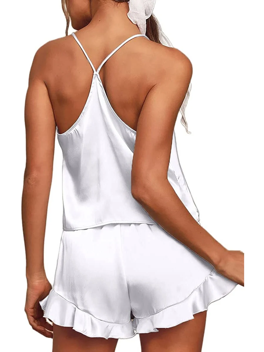 2022 Women's Summer 2PCS Pajamas Satin Loungewear Solid Color Sleeveless V-Neck Camisole + Ruffle Shorts Pajama Pajamas